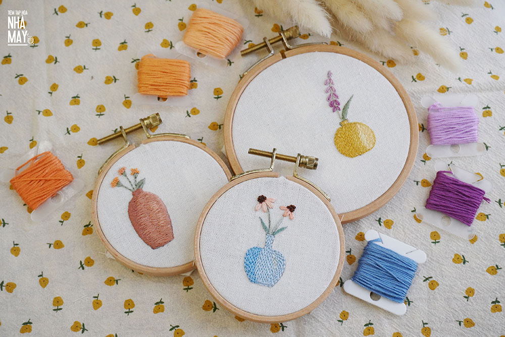 - Khung thêu: khung thêu gồm 3 loại chính: khung thêu tre, khung thêu nhựa và khung thêu gỗ. Bạn xem ở đây nhé https://tiemtaphoanhamay.vn/khung-theu