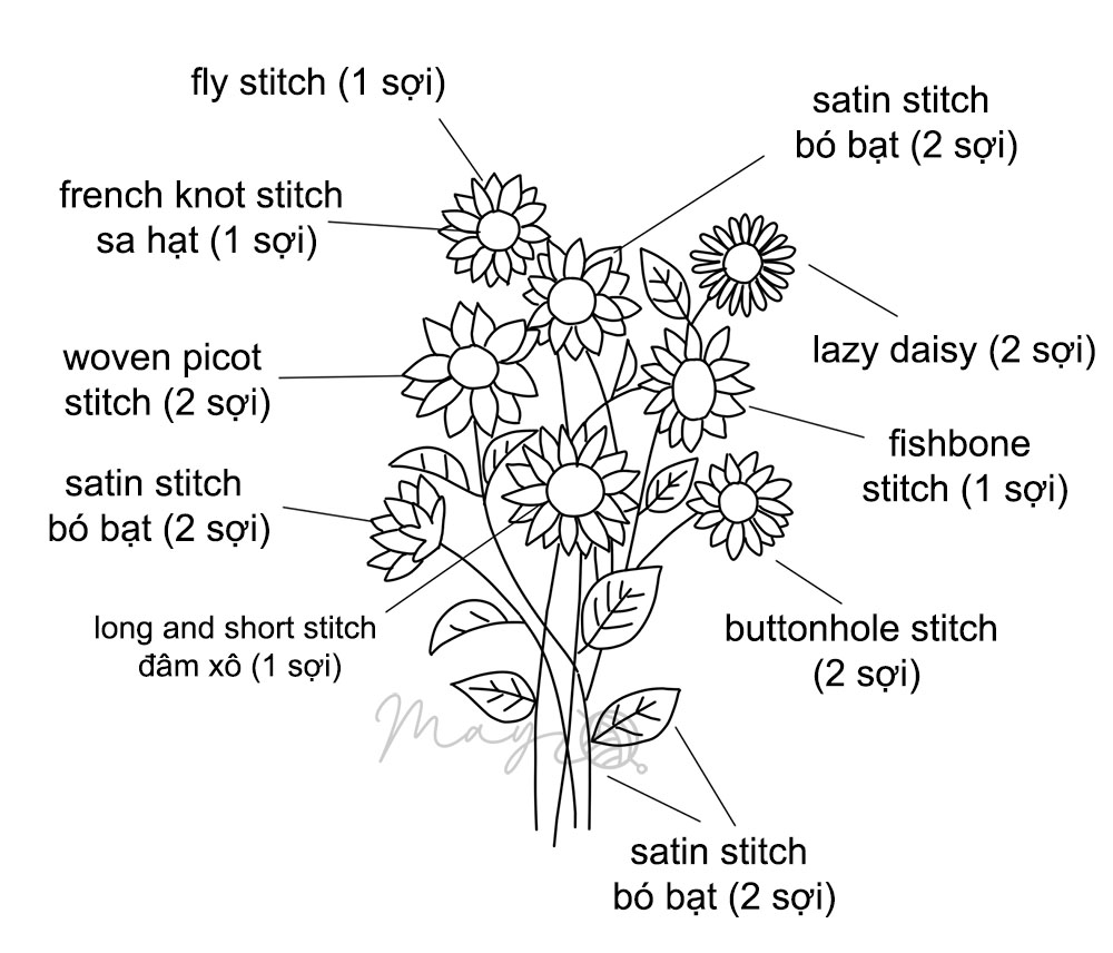 Bài 18: Hướng dẫn 5 cách thêu hoa hướng dương (có mẫu in)