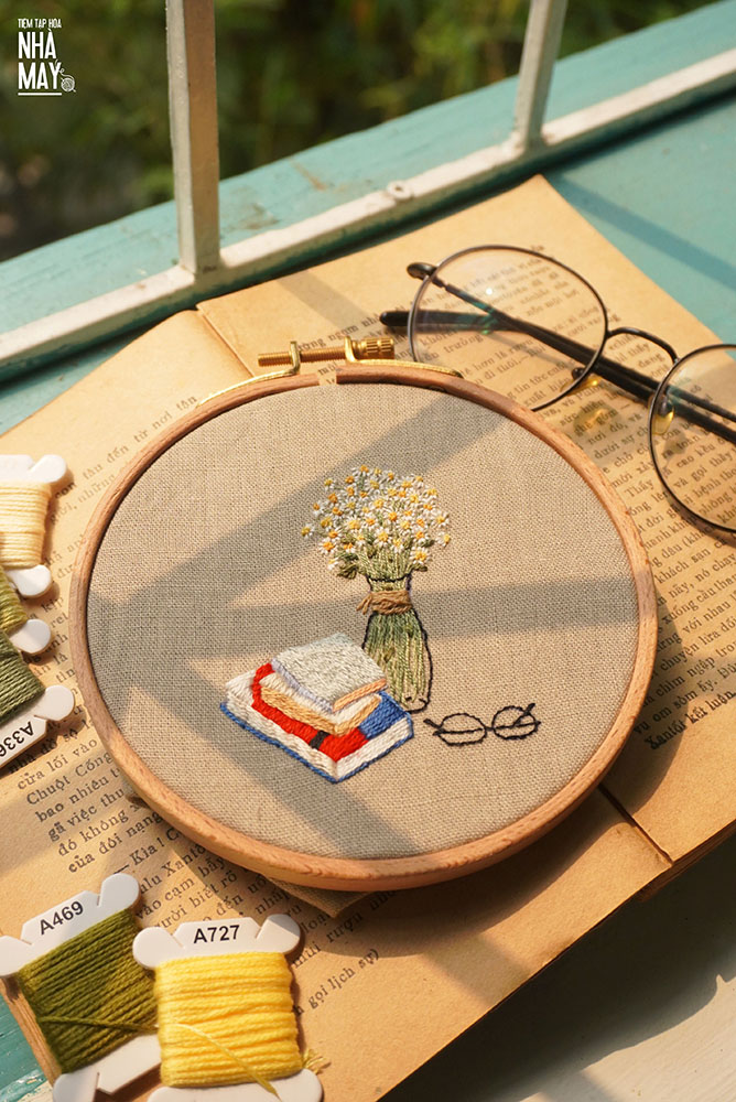 Đầu tuần trời đẹp quá, Tiệm cũng vội thêu ngay một bình cúc họa mi và vài cuốn sách để đón nắng vàng ươm. Những lúc trời đẹp mọi người thường thích thêu gì thế?
