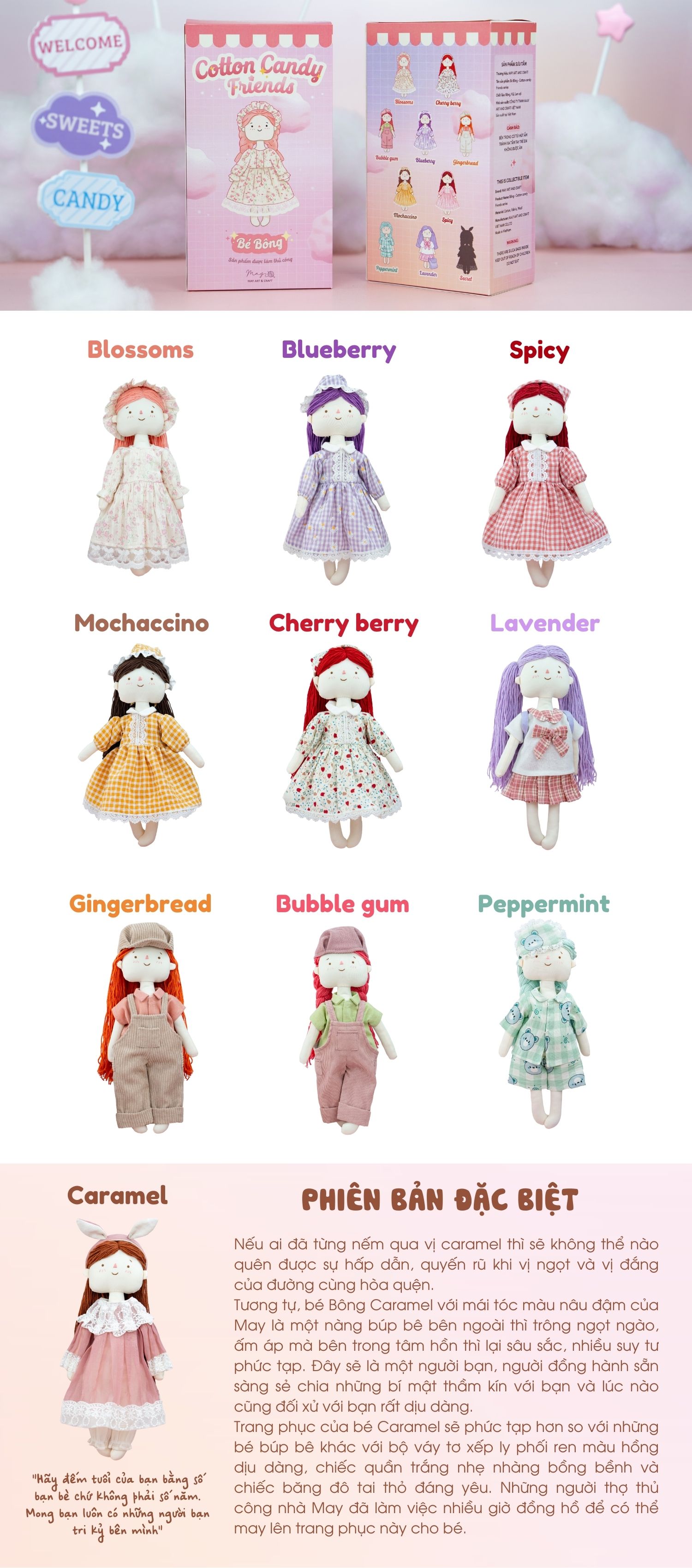 7. Sản phầm Blindbox bé Bông chủ yếu để khách hàng trải nghiệm về phôi búp bê với các màu tóc khác nhau không thể mua lẻ bên ngoài và đặc biệt là có cơ hội săn được phiên bản SECRET là mẫu hiếm. Các trang phục không phải của phiên bản secret đều có thể mua lẻ riêng.