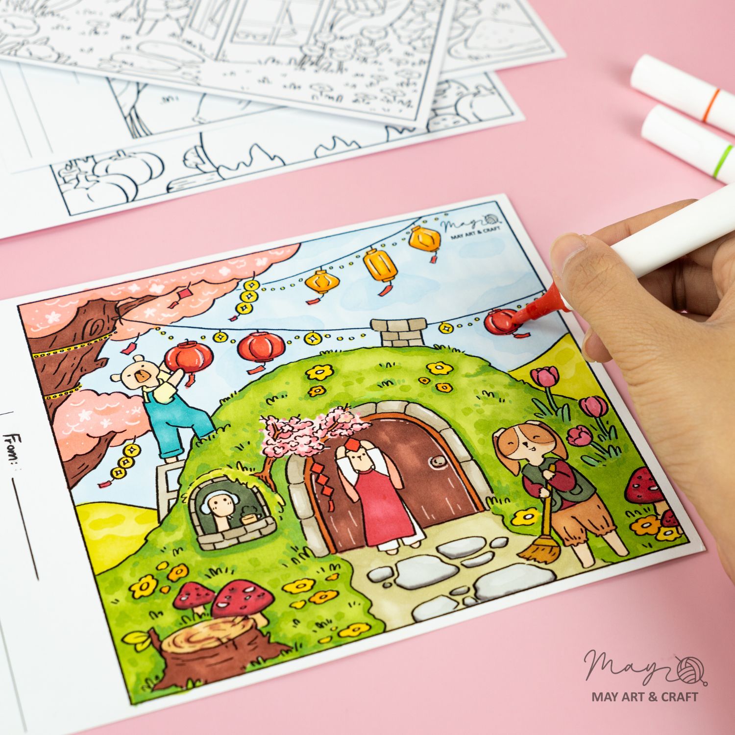 Set 10 tranh tô màu postcard 4 mùa lễ hội bao gồm 10 bức tranh kích thước khổ A5 (14.8 x 21cm) trên chất liệu giấy dày dặn về chủ đề các ngày lễ hội trong năm. Mỗi bức tranh là một câu chuyện bình dị, dễ thương từ các bé thú bông của Tiệm tạp hóa Nhà May. Ngoài việc tô màu thư giãn, bạn có thể dành tặng những tấm postcard này cho những người mà bạn yêu thương, quý mến.