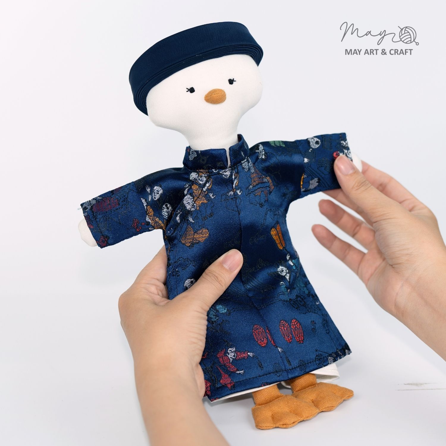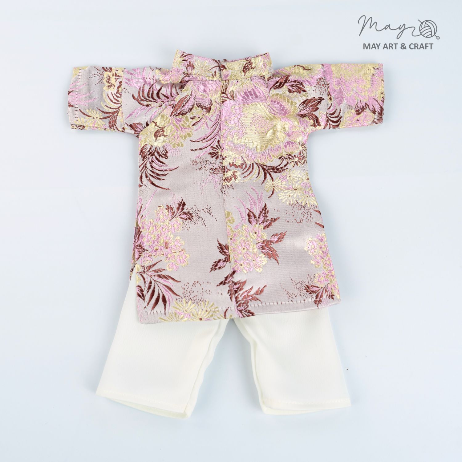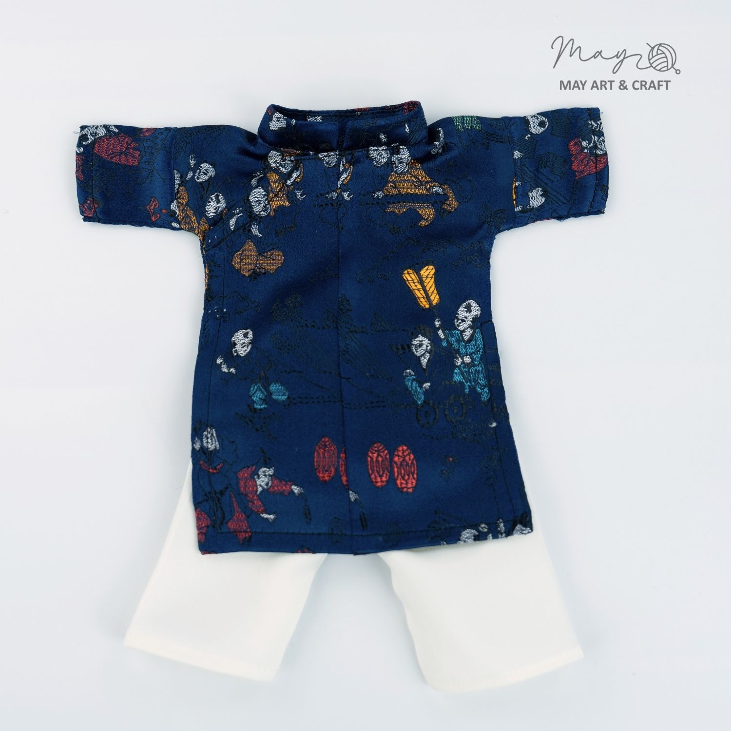 Về kiểu dáng trang phục lấy phong cách Áo Ngũ Thân của May: May giữ nguyên hầu hết cấu trúc và thiết kế của áp ngũ thân truyền thống, có thay đổi số lượng cúc áo từ 5 cúc xuống còn 3 cúc để phù hợp với thú bông và búp bê vải nhà May. Ngoài ra phần cổ áo cũng sẽ không ôm sát hoàn toàn do kích thước cổ của các bé thú bông có độ chênh lệch nhất định. Sản phẩm có thể phối với khăn xếp hoặc mấn (chưa bao gồm trong set) hoặc không cần đội.