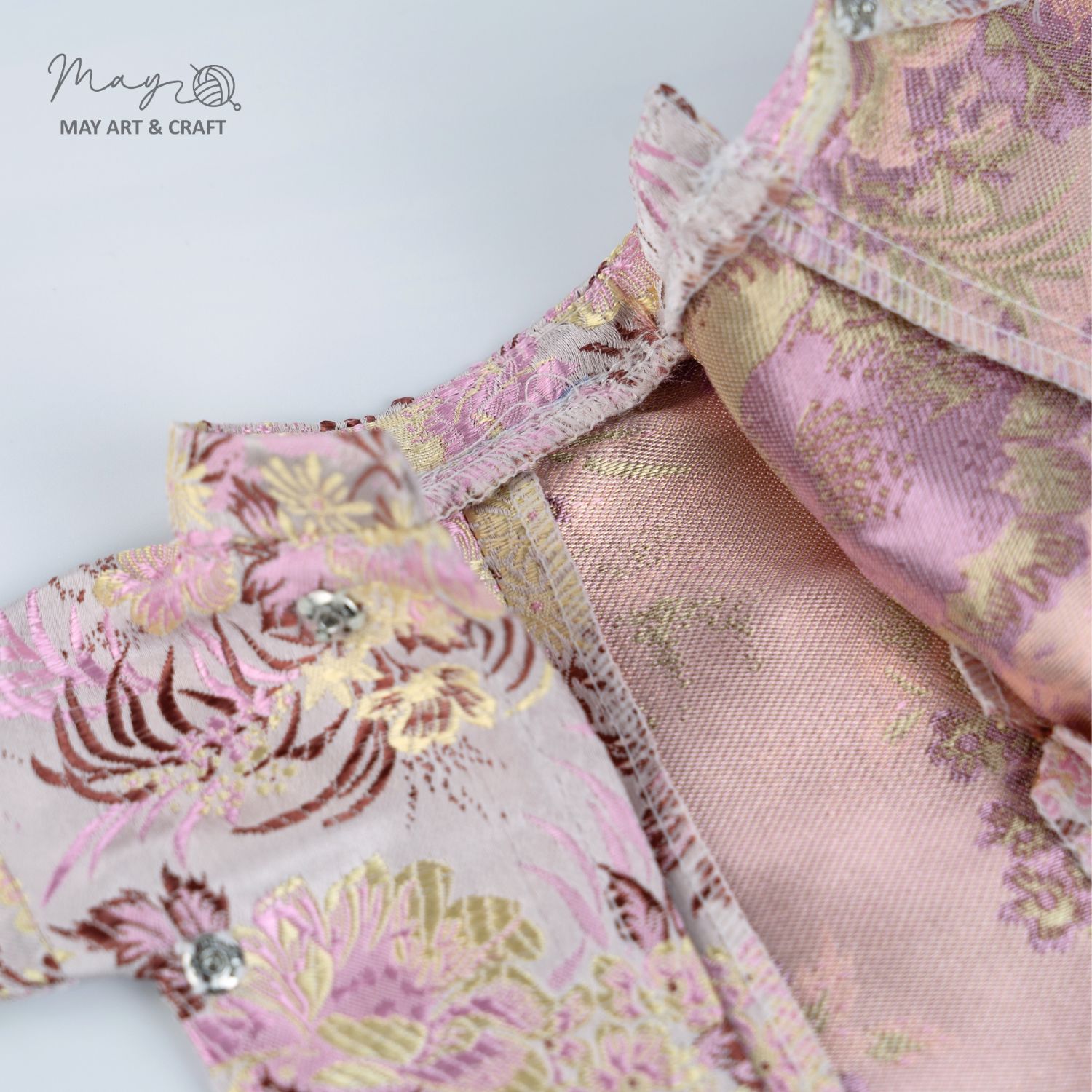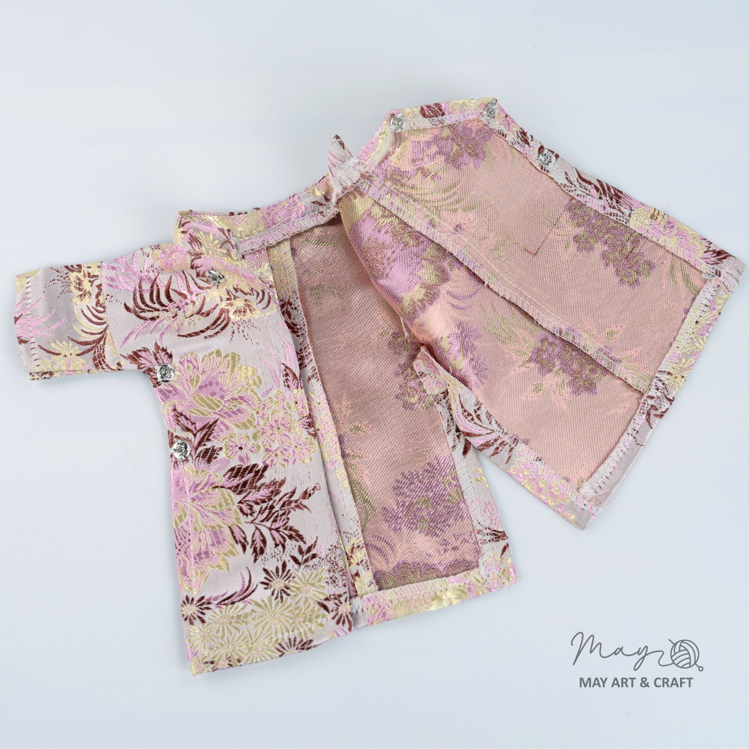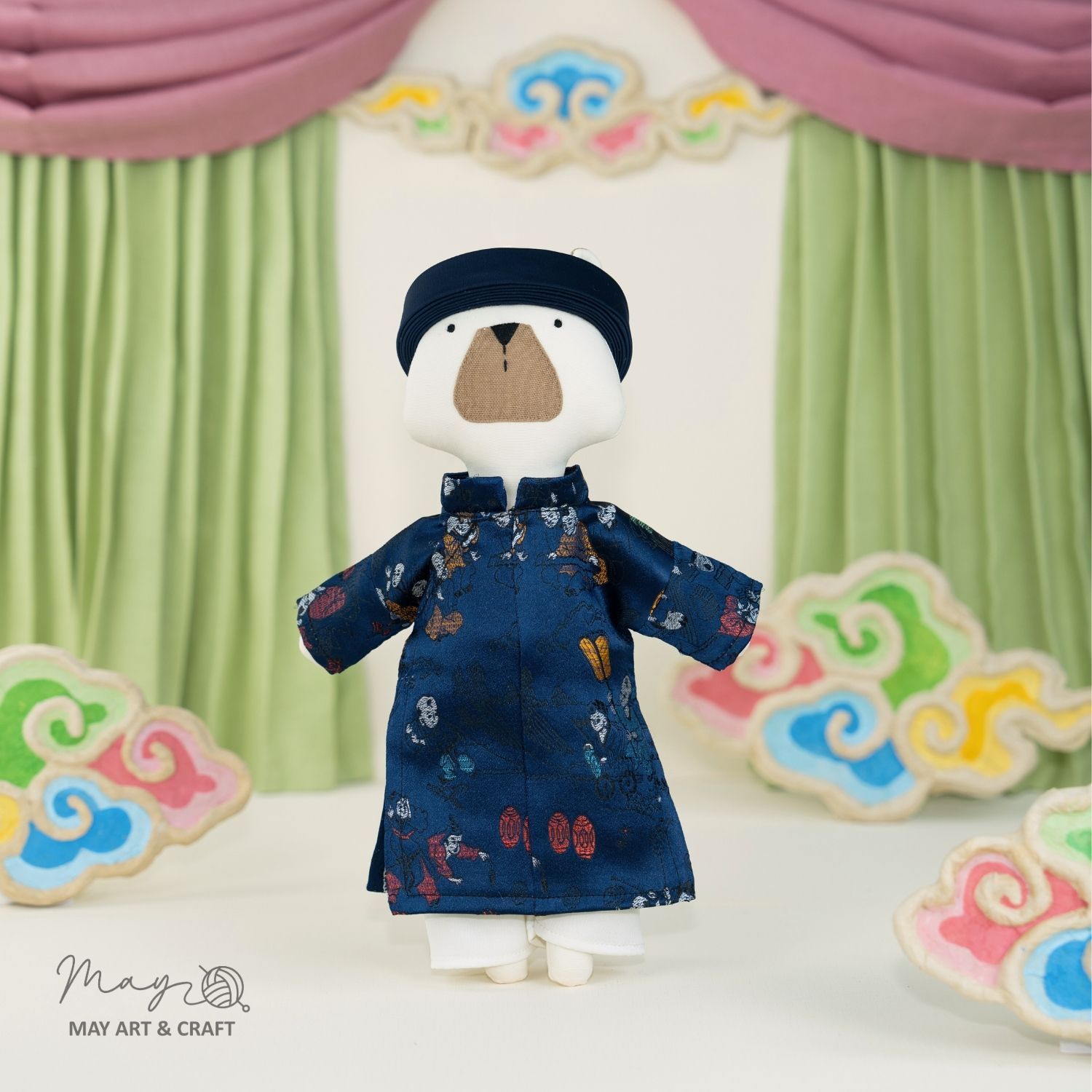 Về kiểu dáng trang phục lấy phong cách Áo Ngũ Thân của May: May giữ nguyên hầu hết cấu trúc và thiết kế của áp ngũ thân truyền thống, có thay đổi số lượng cúc áo từ 5 cúc xuống còn 3 cúc để phù hợp với thú bông và búp bê vải nhà May. Ngoài ra phần cổ áo cũng sẽ không ôm sát hoàn toàn do kích thước cổ của các bé thú bông có độ chênh lệch nhất định. Sản phẩm có thể phối với khăn xếp hoặc mấn (chưa bao gồm trong set) hoặc không cần đội.