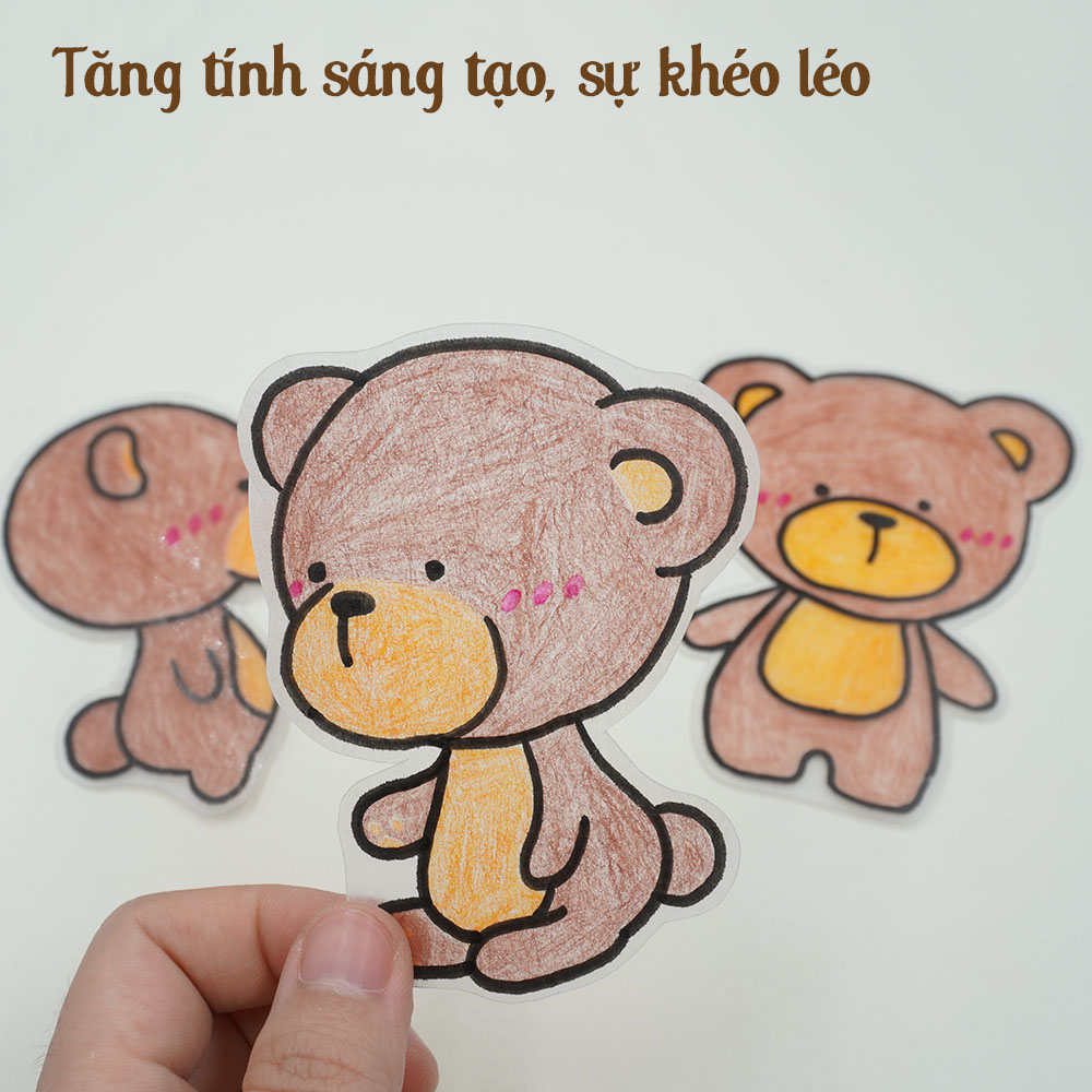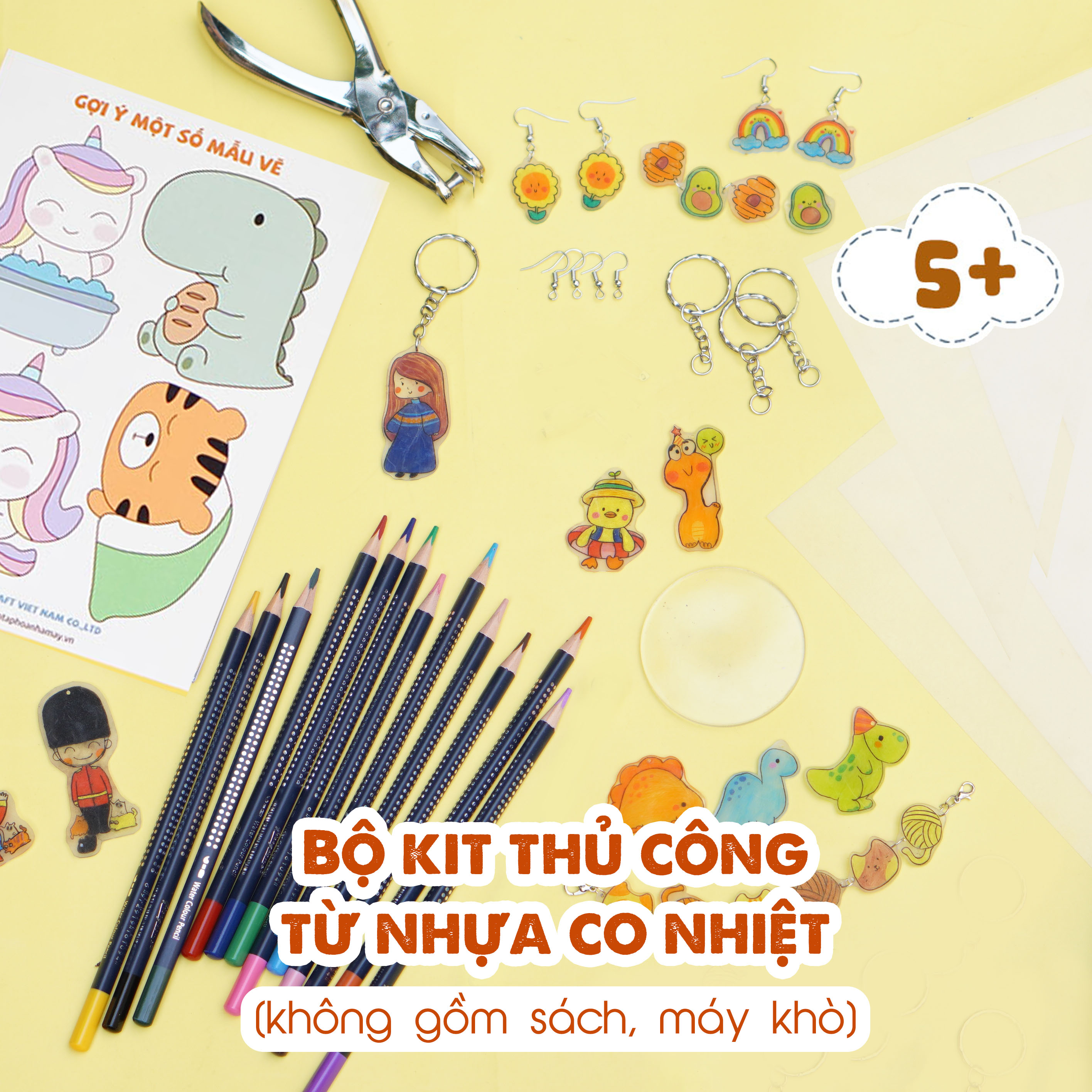 Bộ KIT không gồm sách và máy khò nhiệt, phù hợp với người đã có sẵn lò nướng và có thể sử dụng lò nướng để làm. Sản phẩm dành cho bé từ 5 tuổi có thể vẽ thành thạo và cắt được bằng kéo thủ công cơ bản. Cần sự hỗ trợ của bố mẹ khi sử dụng lò nướng để làm co nhiệt.
