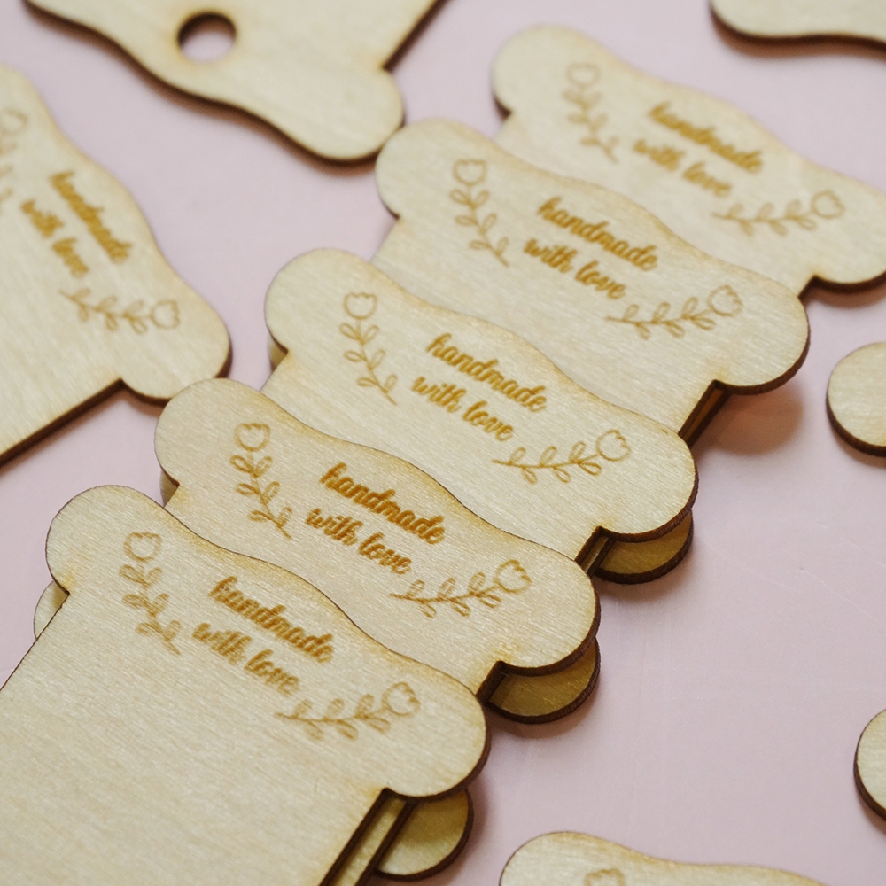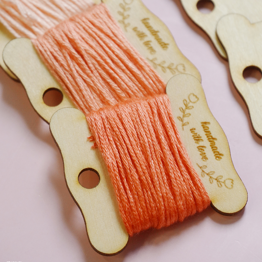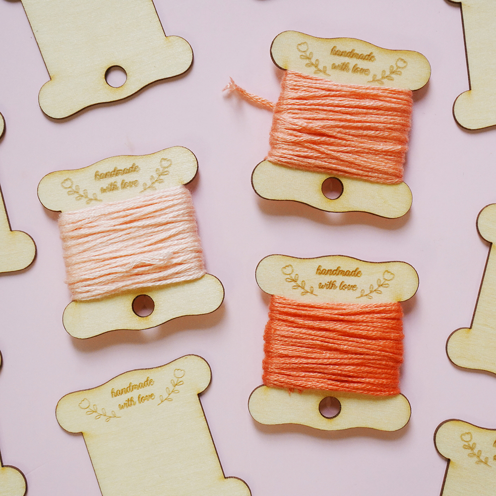 Bobbin (miếng cuốn chỉ) với hình dáng cơ bản được khắc họa tiết, chất liệu gỗ dày 1.5mm, kích thước khoảng 4cm x 3,5cm