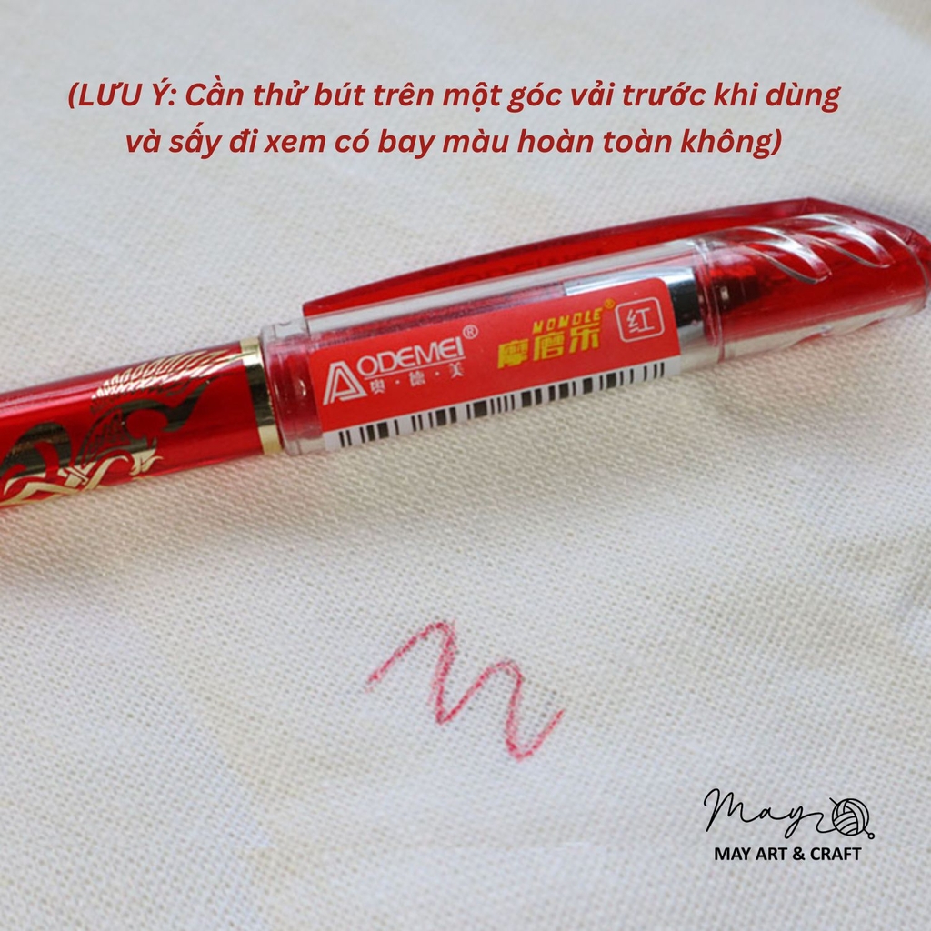 LƯU Ý CỰC KỲ QUAN TRỌNG: Cần thử bút trên một góc vải trước khi sử dụng và sấy đi xem có bay màu hoàn toàn không trước khi sử dụng do đặc thù của số vải (đặc biệt là vải sẫm màu hoặc vải thun co giãn) sau khi sử dụng bút vẫn có thể để lại vệt trắng.