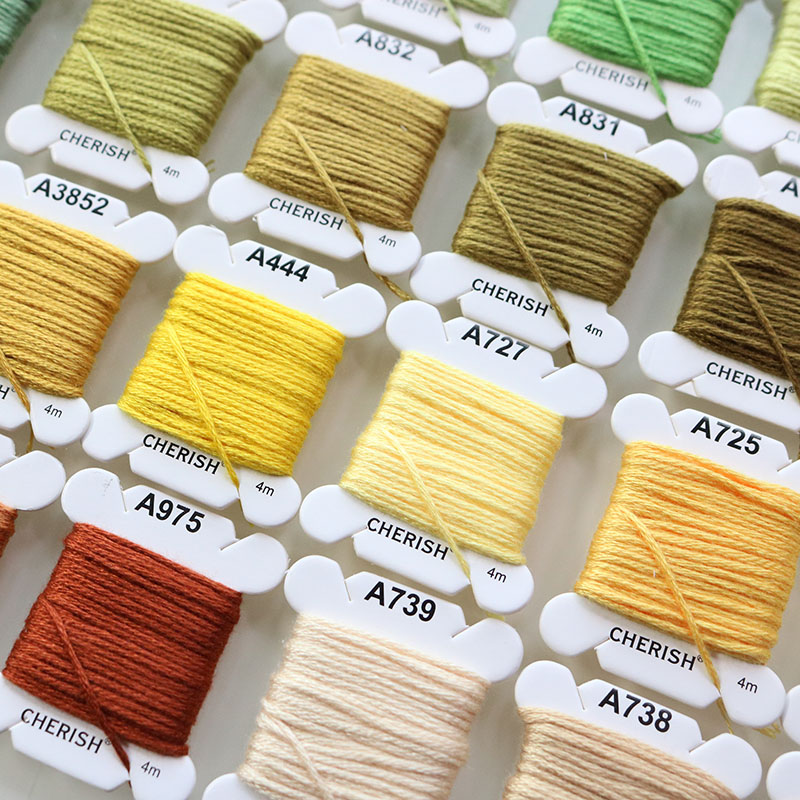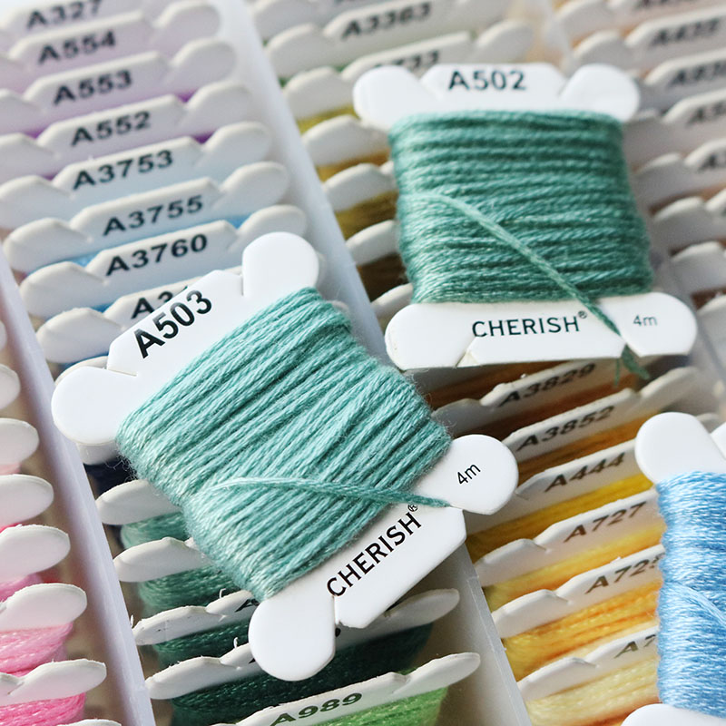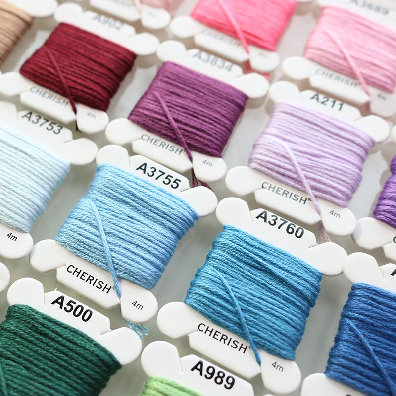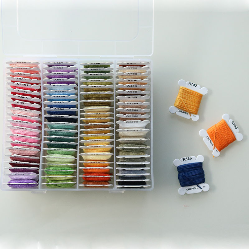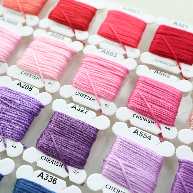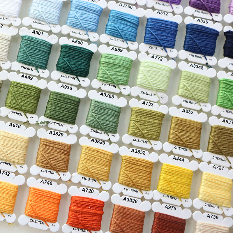 Set chỉ thêu cotton hãng Cherish 80 màu đủ tone cơ bản theo mã màu DMC, sợi chỉ mềm, trơn, dai và bền chắc, không phai màu.