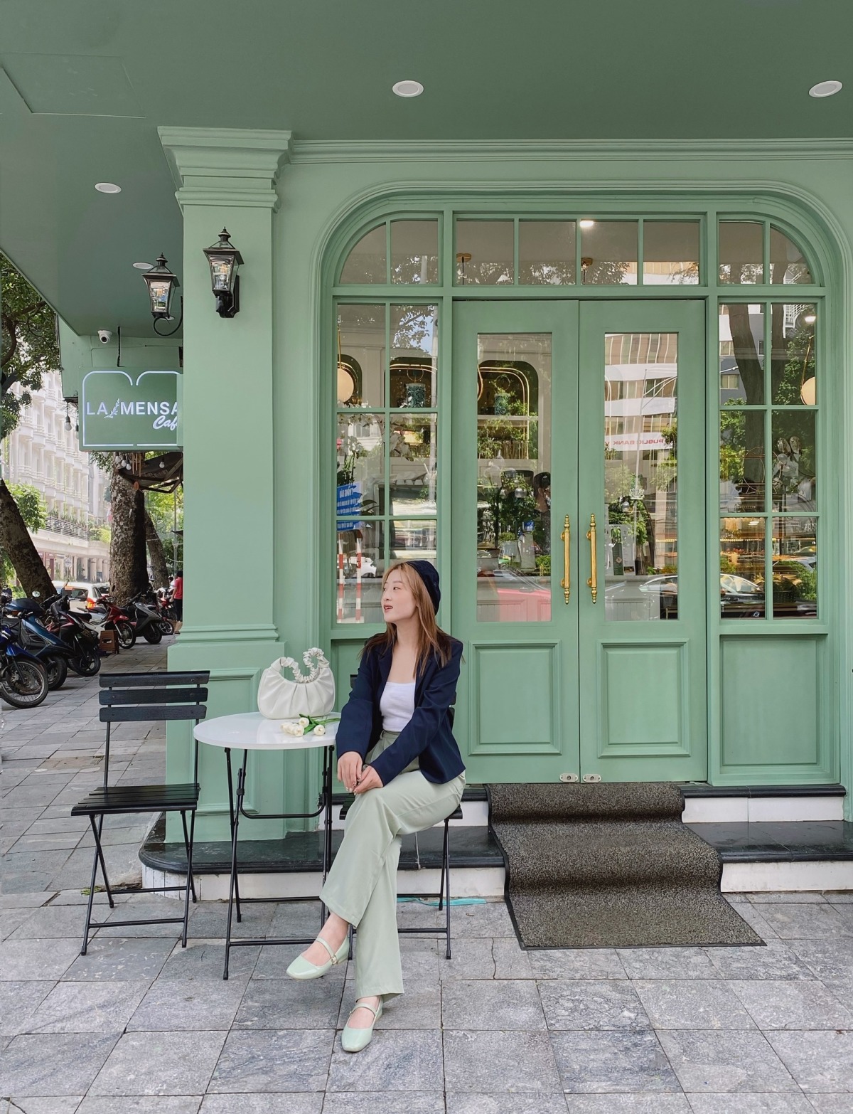 Quán nổi bật với tông màu xanh nhạt, hiện đại nhưng vẫn mang tới sự hài hòa với không gian xung quanh. Quán có một số chỗ ngồi phía trước, cùng 4 tầng bên trong nhà. Các chỗ ngồi đều gần cửa sổ khung kính lớn tạo tầm nhìn cho khách, vừa tận hưởng đồ uống vừa được ngắm phố bình yên ngày Tết.