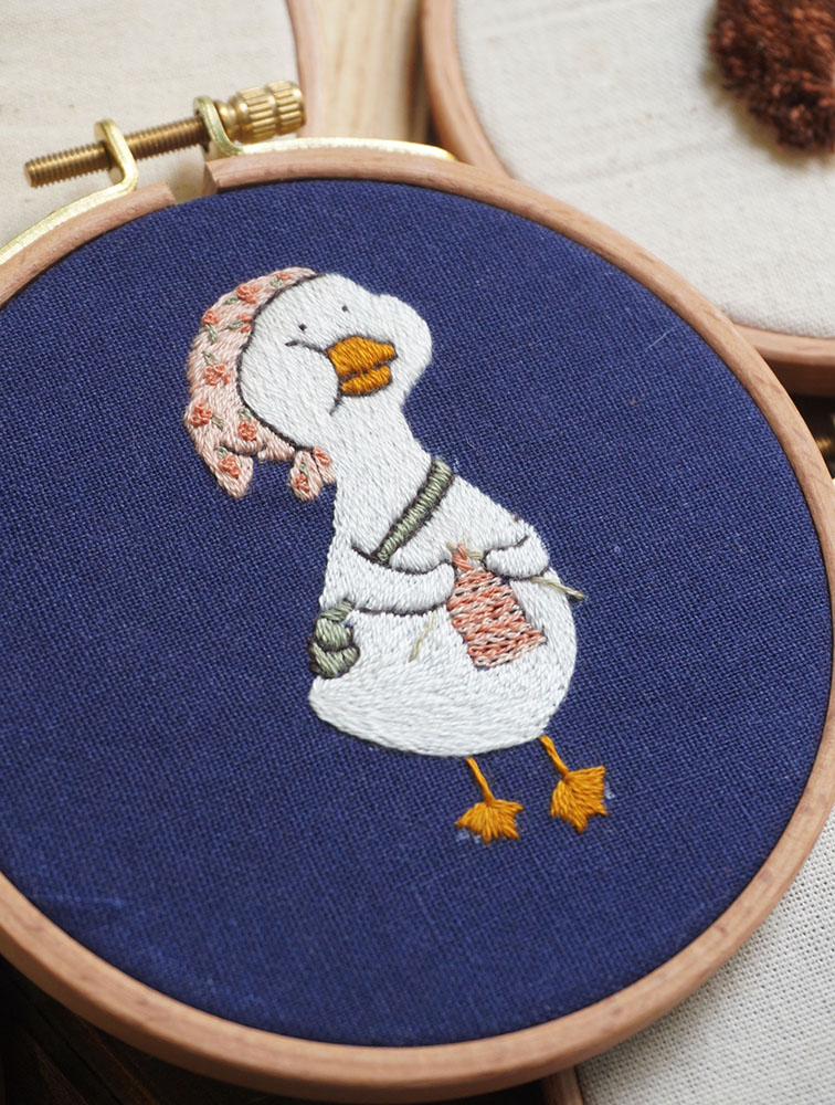 Hướng dẫn chi tiết thêu cô vịt điệu đà. Cô vịt không những có khăn đội đầu, túi đeo chéo mà còn đứng đan len nữa mọi người ạ. Cưng để đâu cho hết! Mọi người tập thêu với Tiệm bằng những mũi thêu cơ bản nha.
