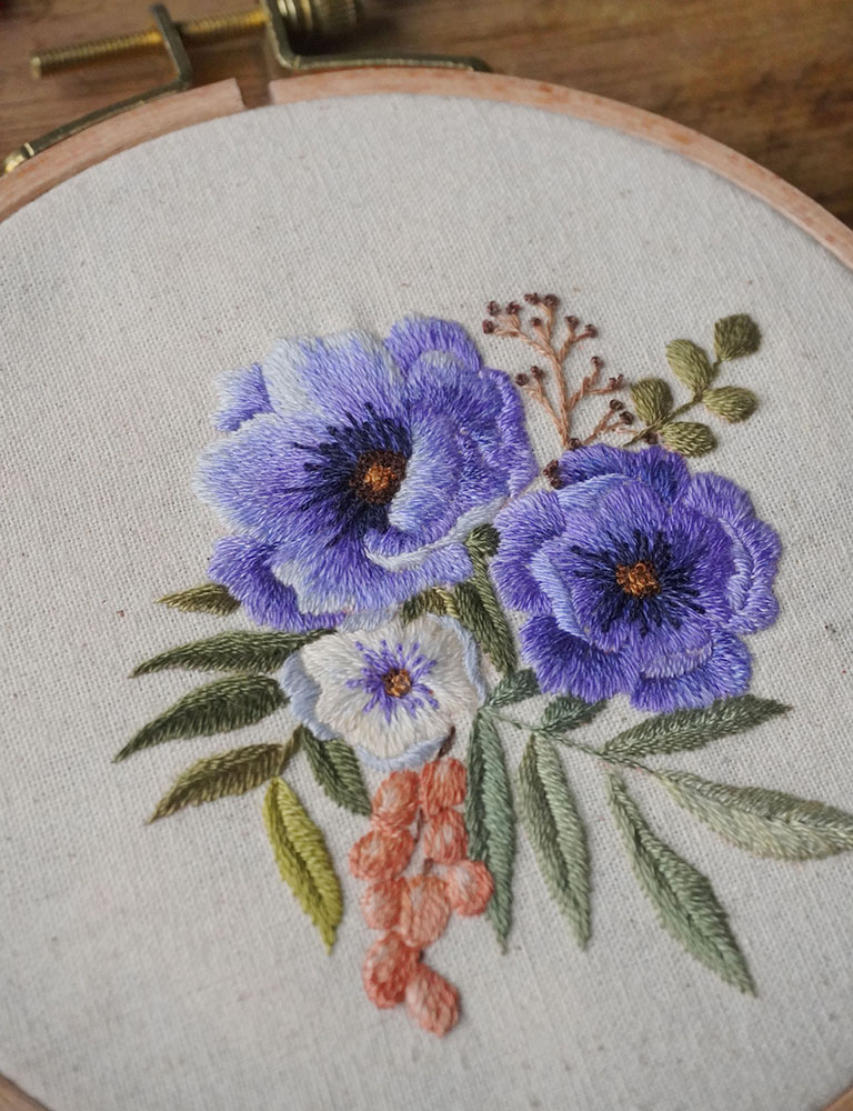 Học thêu cơ bản qua cách phối màu hoa xanh tím.