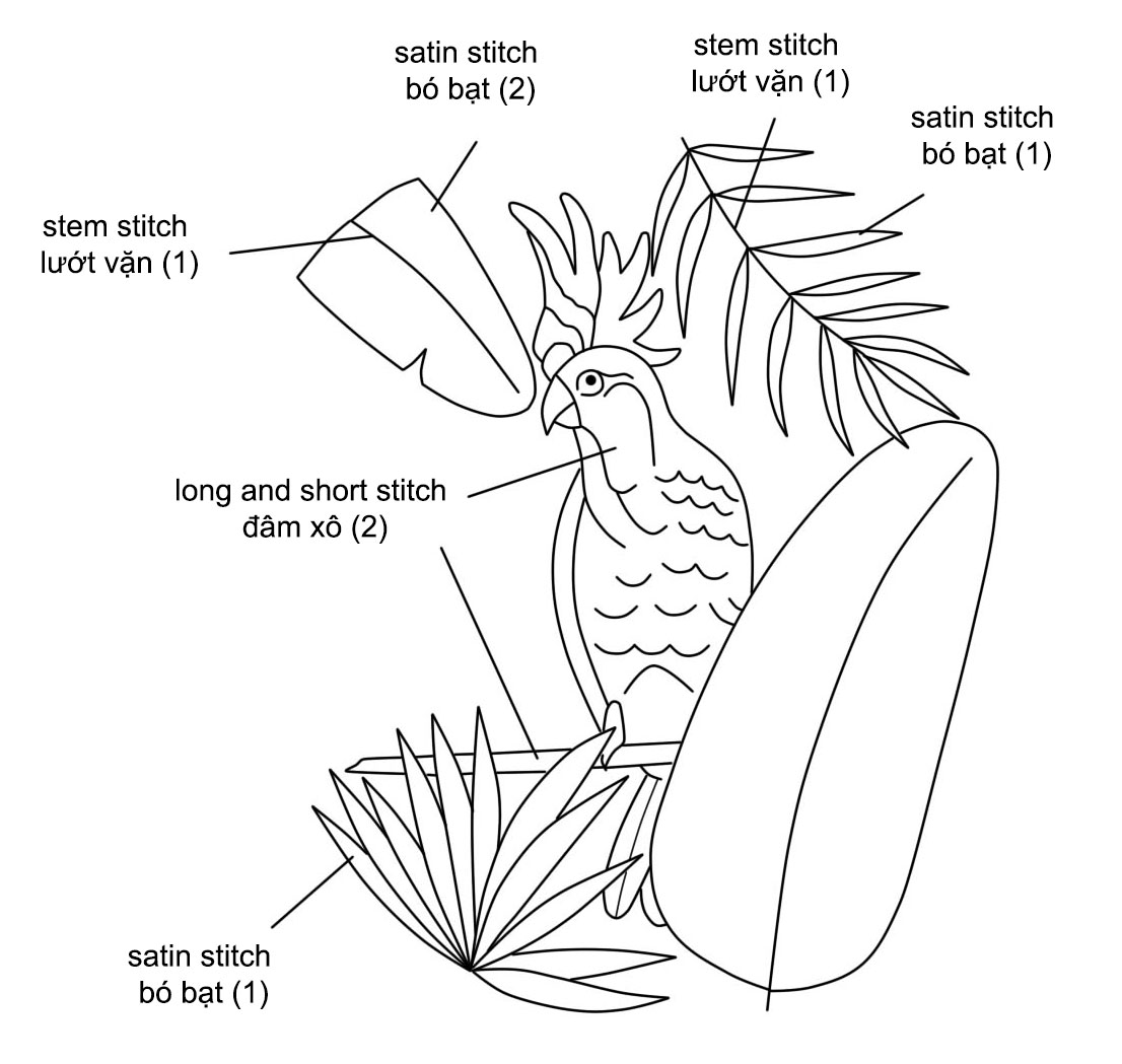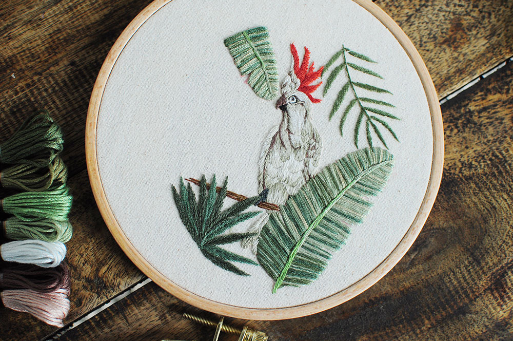 Học thêu cơ bản: Thêu chú vẹt giữa rừng nhiệt đới (có mẫu in)