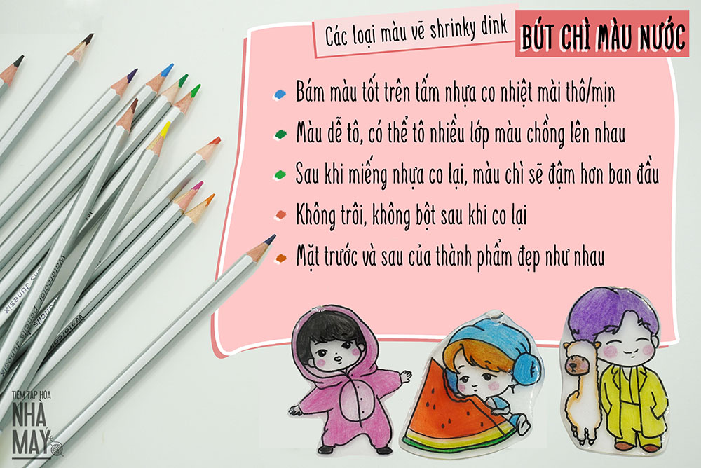 Ngoài ra, bút chì có thể sử dụng để vẽ lên tấm nhựa co nhiệt, sau khi làm co miếng nhựa lại, màu chì sẽ đậm hơn ban đầu một chút và không bị bay màu, giúp bạn dễ dàng tạo ra những sản phẩm handmade nhiều màu sắc.