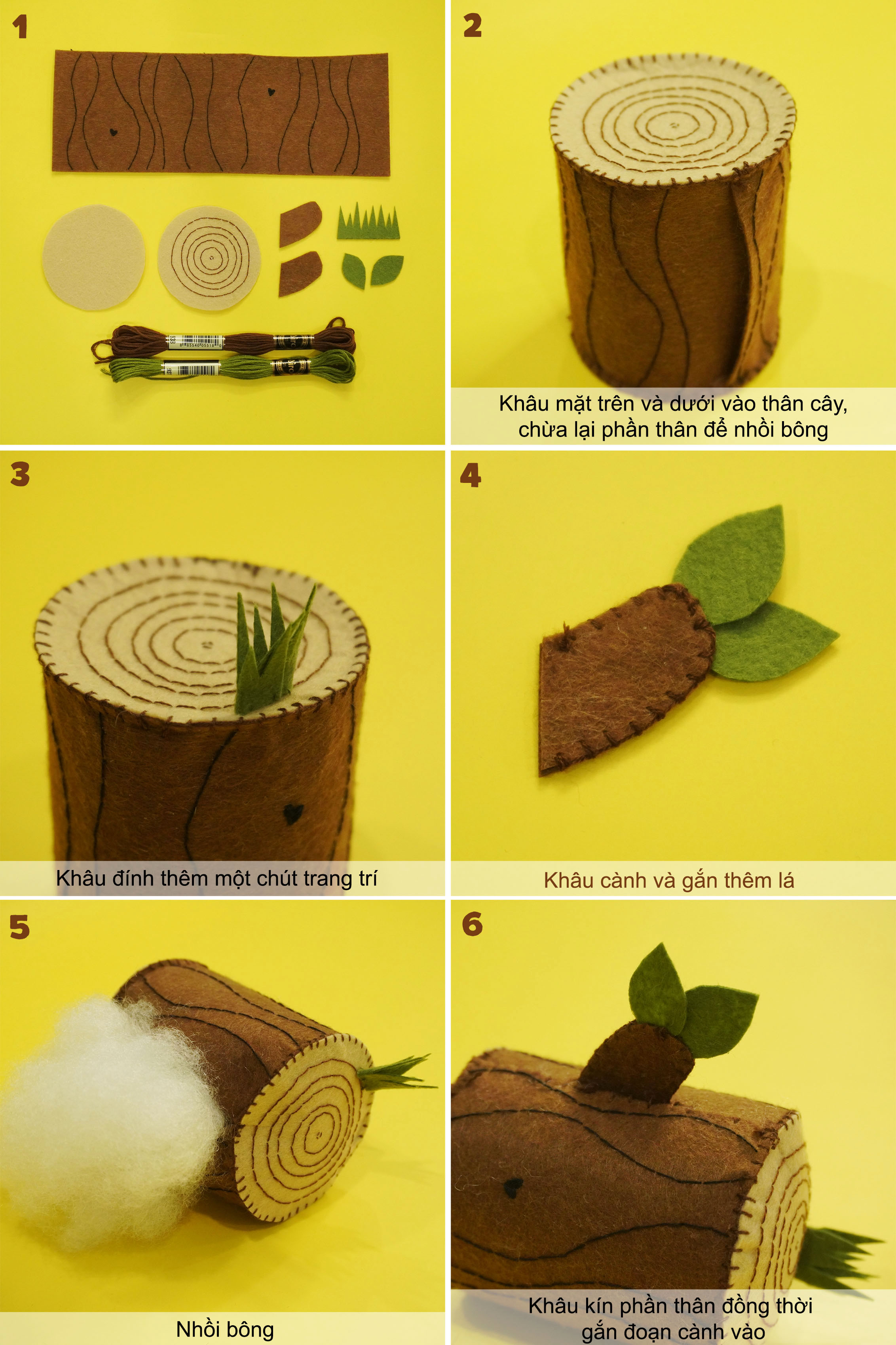 Hướng dẫn làm gối cắm kim hình thân cây bằng vải dạ