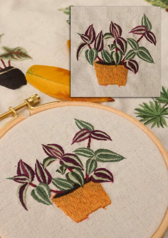 Một loài cây nữa cũng khá quen thuộc để trồng trong nhà và thêu lên cũng rất xinh nữa. Vẫn ứng dụng các mũi thêu cơ bản thôi.