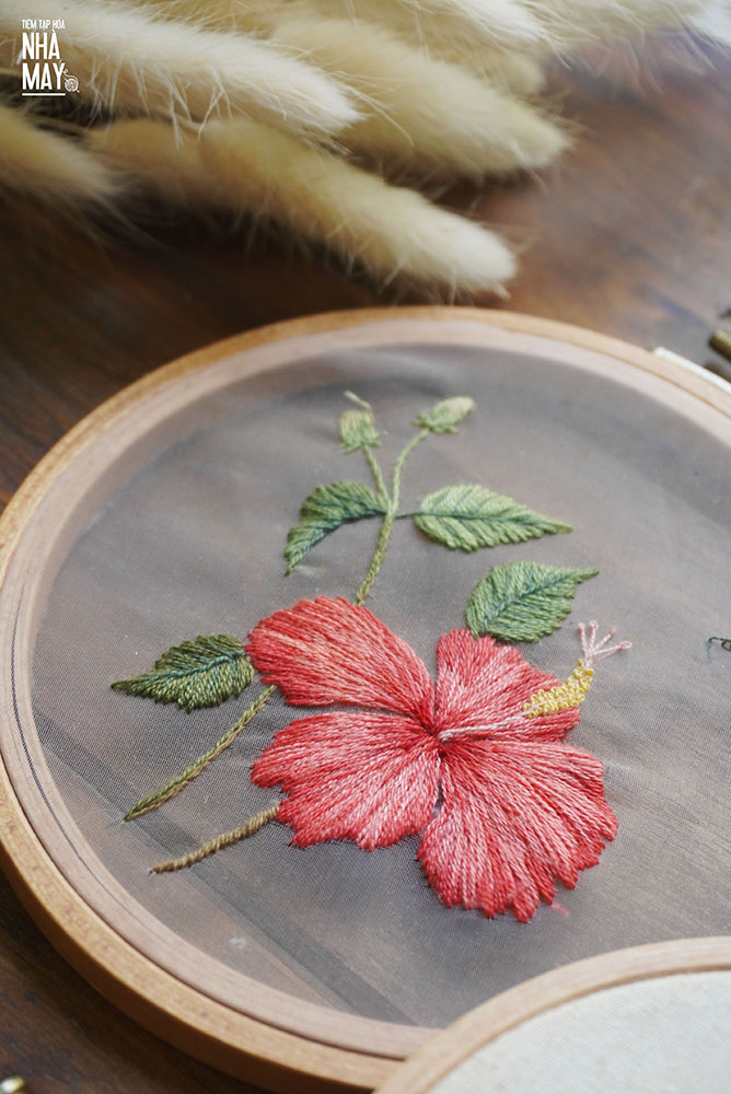 Thêu trên vải voan kính đòi hỏi sự cẩn thận và tỉ mỉ trong từng mũi thêu, để mặt sau của bức thêu không bị lộ ra ảnh hưởng đến mặt trước. Nếu mới bắt đầu dấn thân vào niềm đam mê thêu thùa mà vẫn muốn thêu trên vải voan kính, bạn hãy thử với một bức thêu kín như bông hoa dâm bụt này nhé, sẽ giúp che đi mặt phía sau rất hiệu quả đấy!