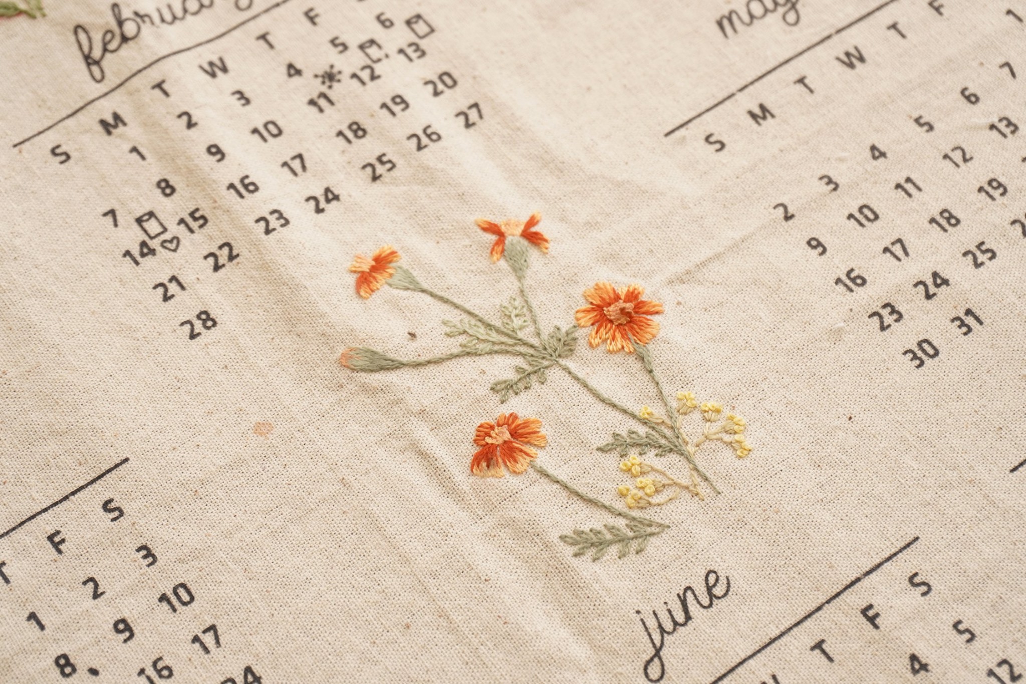 Bắt đầu bằng khóm hoa cúc dại màu cam, phối màu đơn giản và cực kì hợp với lớp nền thô mộc của lịch.