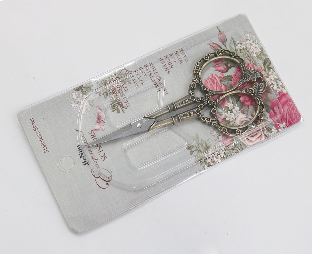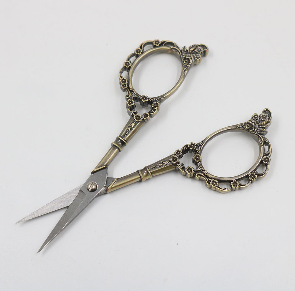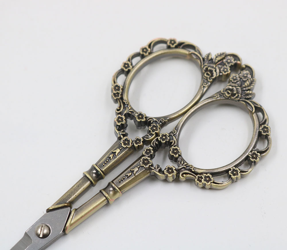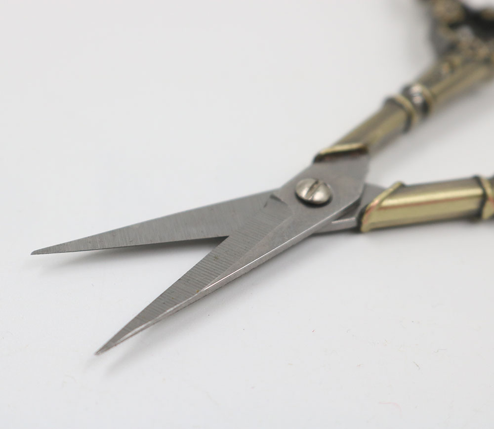 Kéo cắt chỉ mạ đồng phong cách vintage. Tay cầm kéo có hoa văn trang trí đẹp mắt, giúp chiếc kéo không chỉ dùng để cắt chỉ và các chi tiết nhỏ mà còn có thể dùng làm vật dụng trang trí.