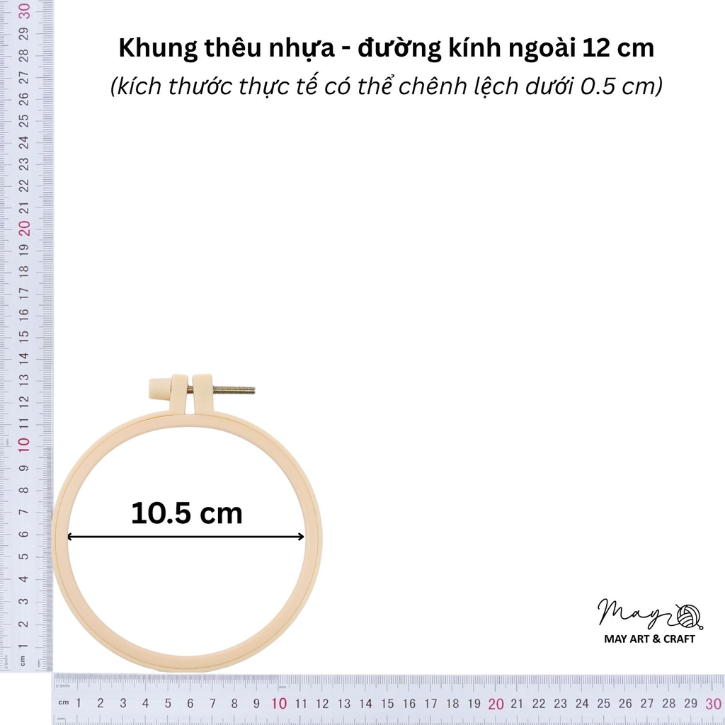 Khung thêu bằng nhựa, màu be, khung cứng cáp, có chốt chắc chắn. 2 khung trong và ngoài có rãnh khớp với nhau giúp căng vải chắc chắn, không bị trơn.