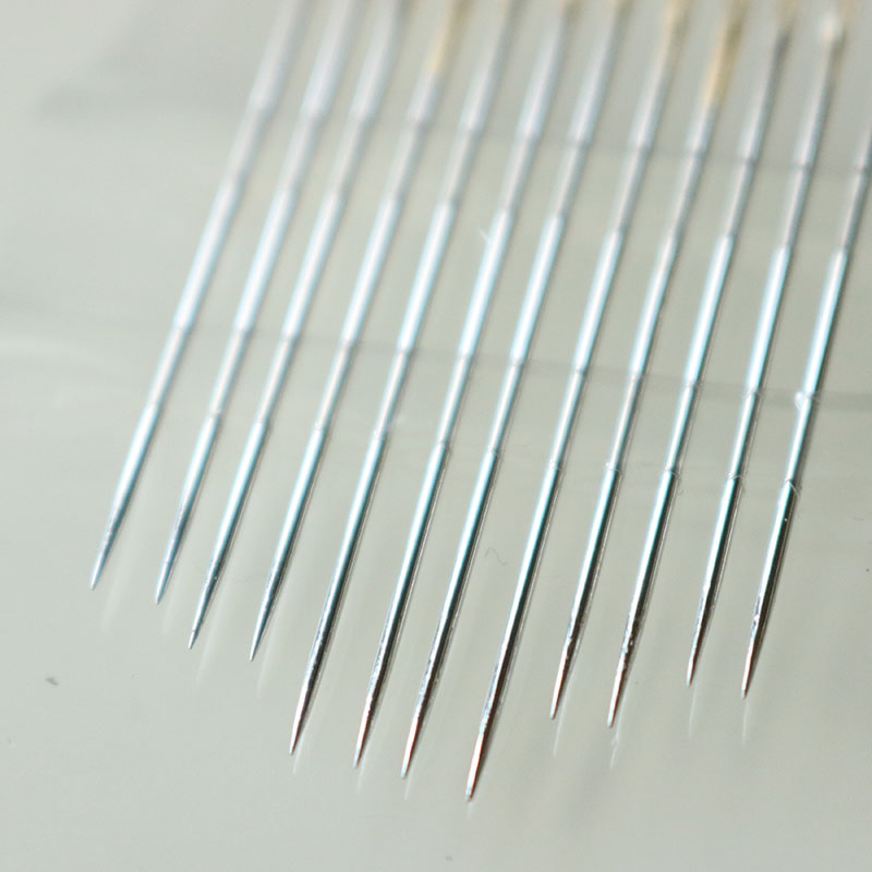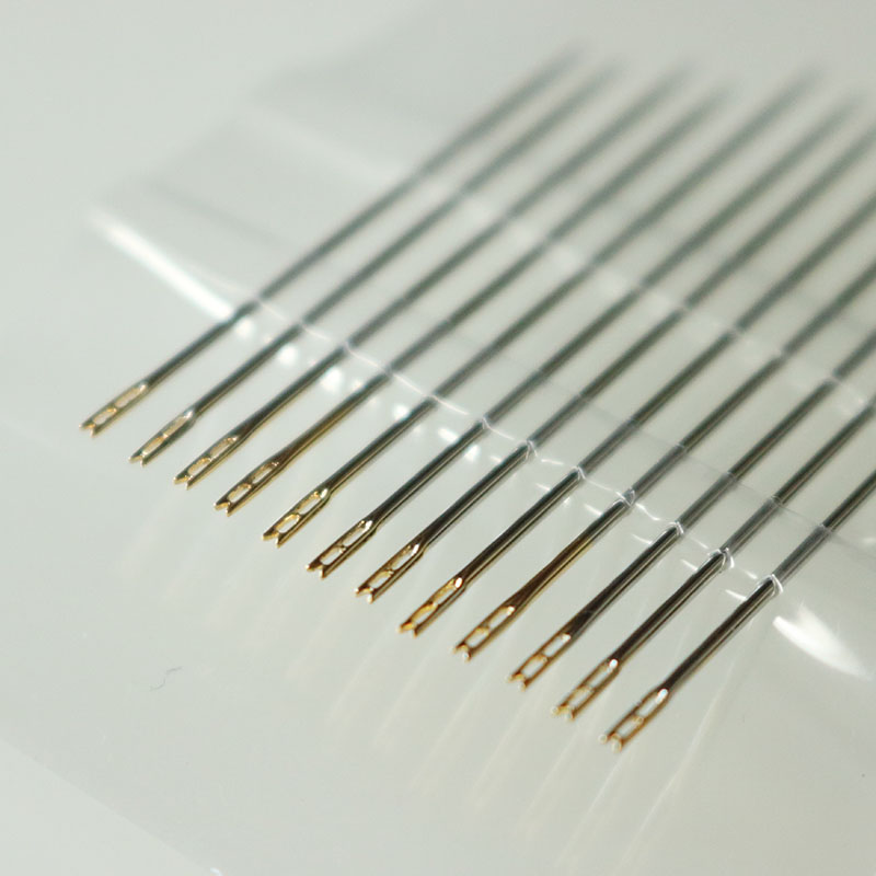 Kim 2 lỗ tiện lợi trong quá trình thêu. Với lỗ kim phía trên, bạn chỉ cần kéo chỉ qua rãnh ở đầu kim mà không phải luồn chỉ. Với lỗ kim phía dưới, bạn luồn chỉ như với kim thêu thông thường.