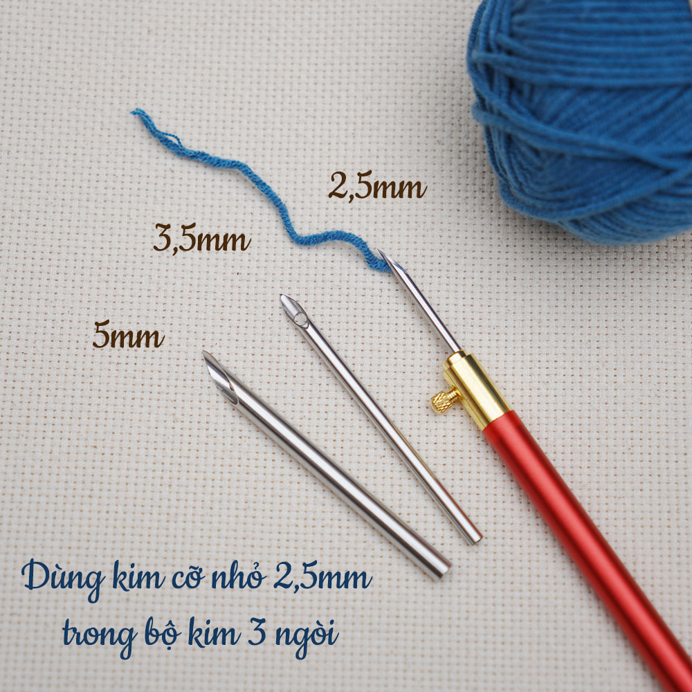 Ngòi kim phù hợp khi thêu punch needle với len 1mm là kim nhỏ (2,5mm) trong bộ kim thêu nổi 3 kim