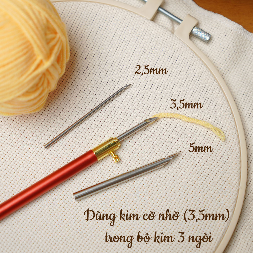 Ngòi kim phù hợp khi thêu punch needle với len 2mm là kim nhỡ (3,5mm) trong bộ kim 3 ngòi kim loại hoặc kim cán gỗ.
