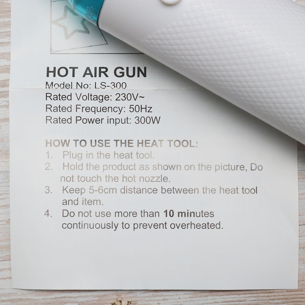 Máy khò nhiệt sử dụng nguồn điện 220V, công suất 300W, trọng lượng 330g, nhiệt độ tỏa ra là 200 độ C nên chỉ thích hợp sử dụng trong làm handmade, không phù hợp để sấy tóc hay các mục đích khác.