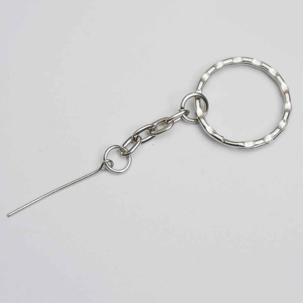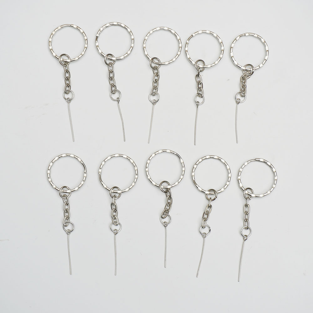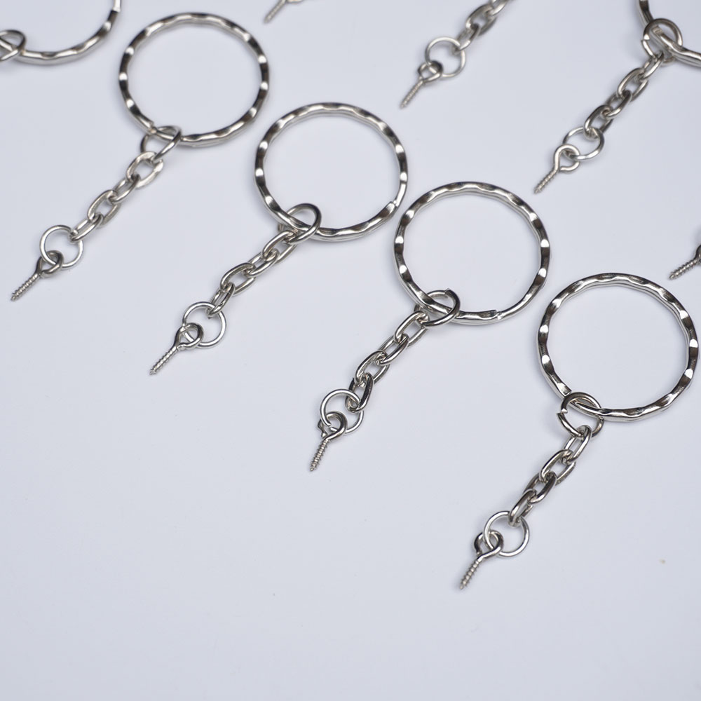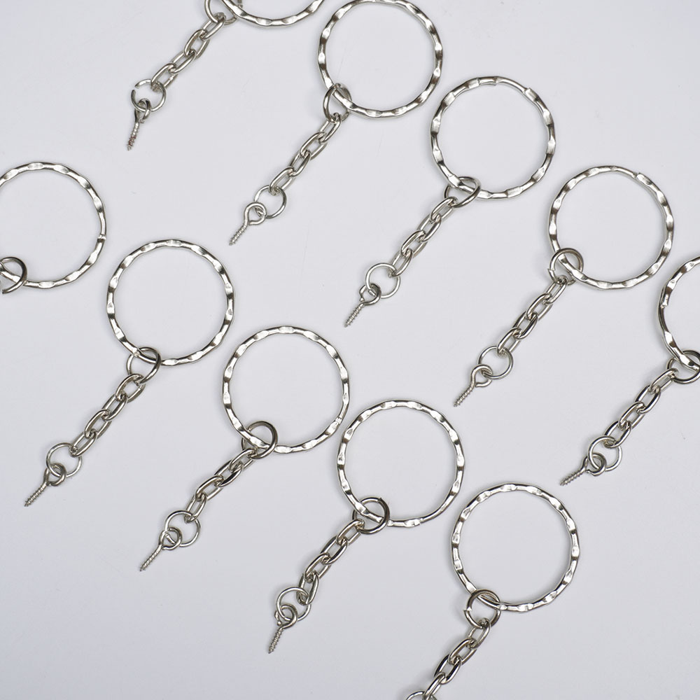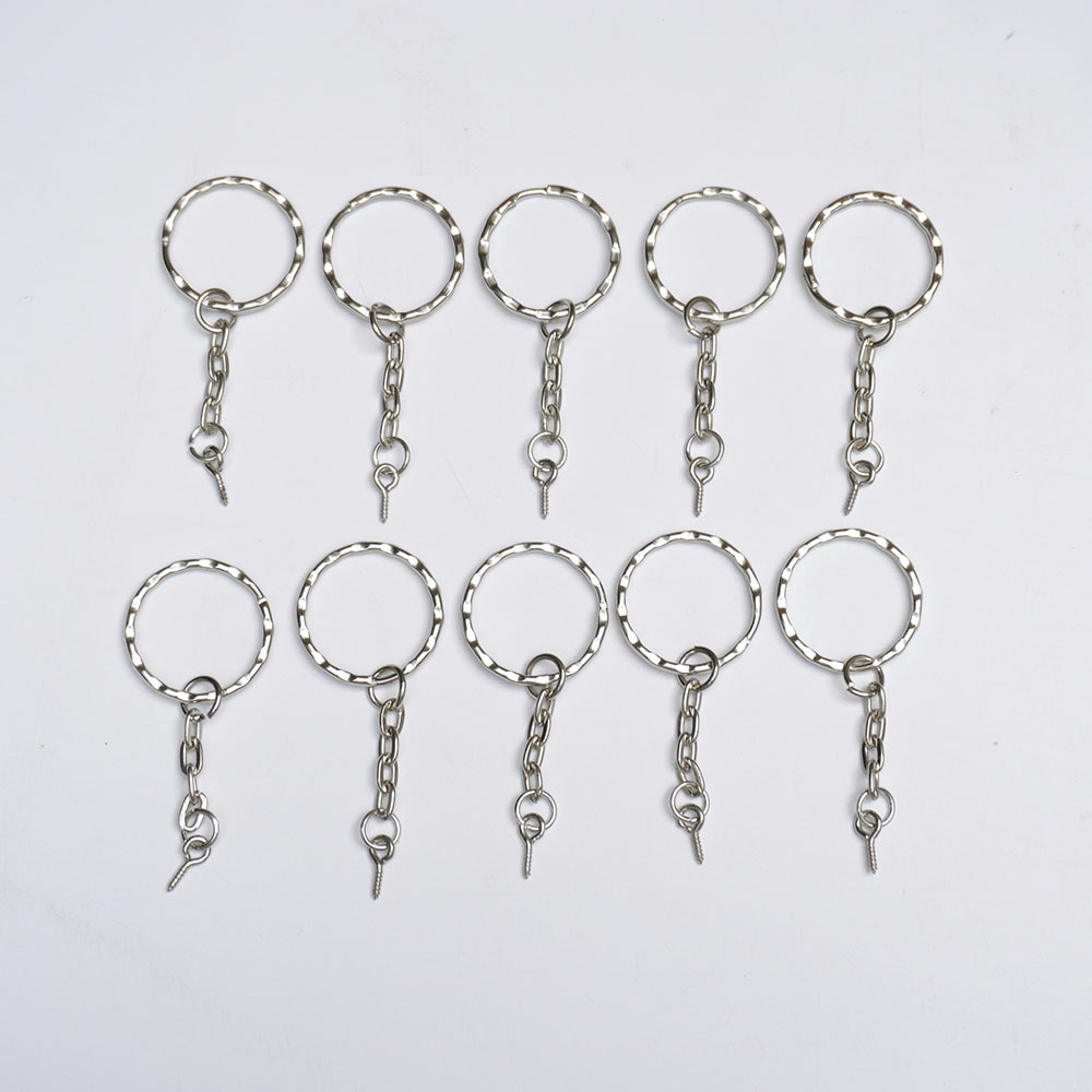 Móc chìa khóa chất liệu kim loại, có đường viền gợn sóng, đường kính 2.5cm, dày 0.2cm. Móc chìa khóa có kèm 6 móc xích.