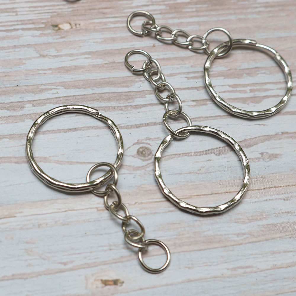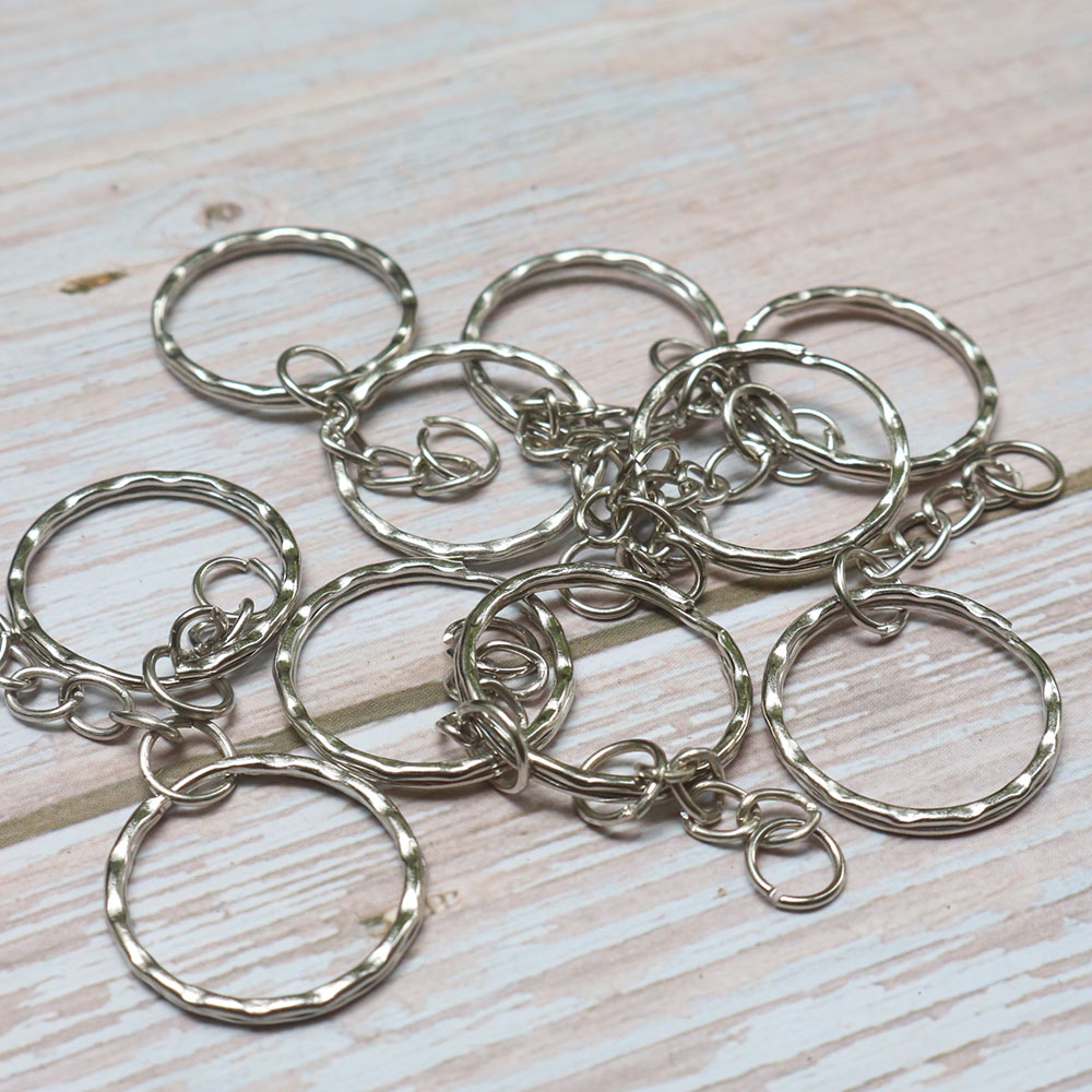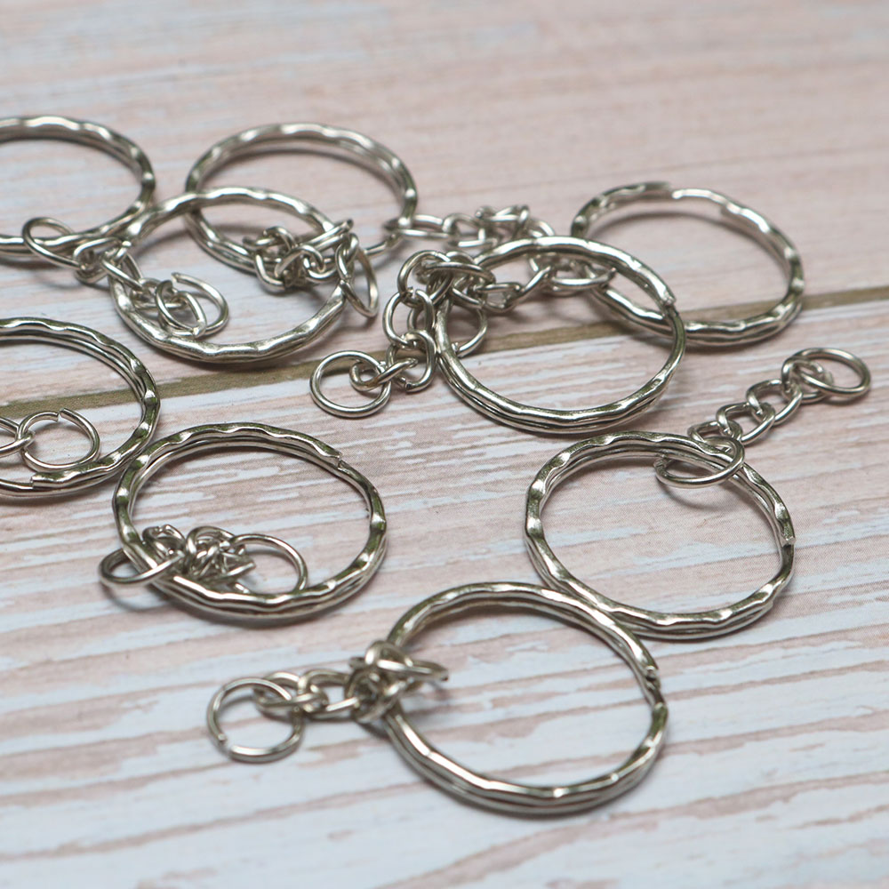 Móc chìa khóa chất liệu kim loại, có đường viền gợn sóng, đường kính 2.5cm, dày 0.2cm. Móc chìa khóa có kèm 6 móc xích.