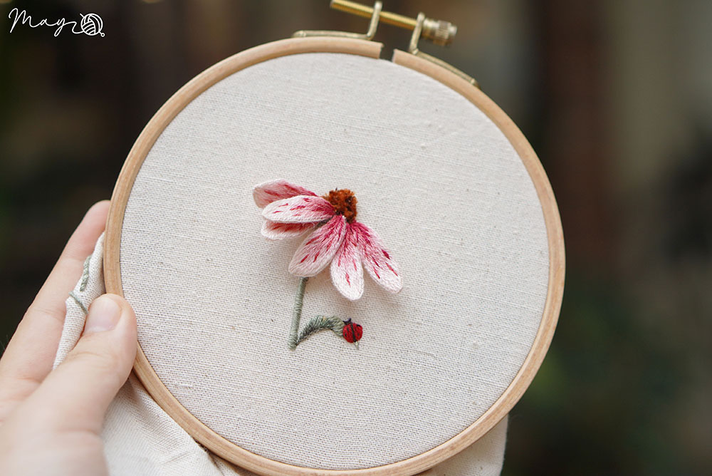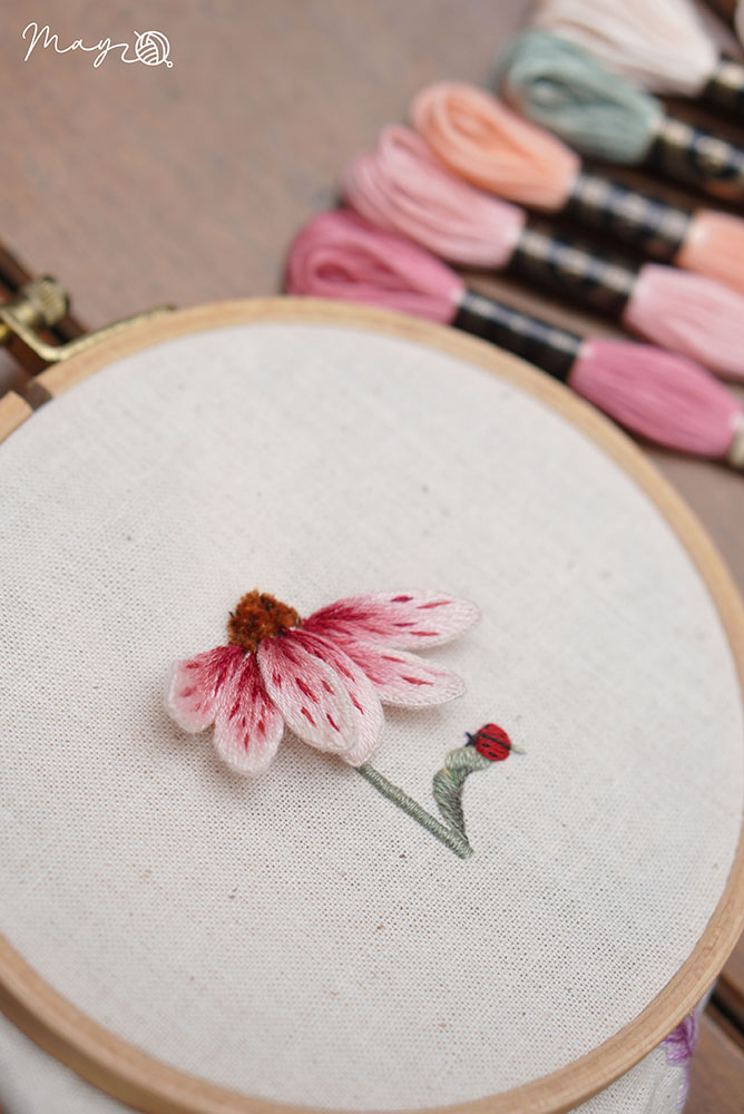 Phối màu thêu đâm xô và tạo hình cánh hoa với vải voan kính
