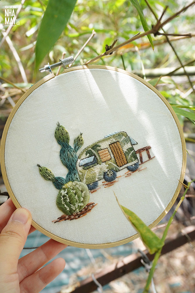 Phối tông màu xanh lá cho bức thêu mang âm hưởng mùa hè.