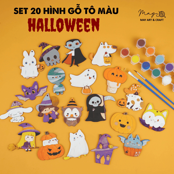 Set tự tô màu gỗ trang trí gồm 20 hình gỗ chủ đề Halloween, kích thước cao khoảng 5-8cm, với chất liệu gỗ ép basswood dày dặn sẽ là món quà ý nghĩa để con có thể tự tay tô màu làm hình trang trí ngày lễ Halloween.