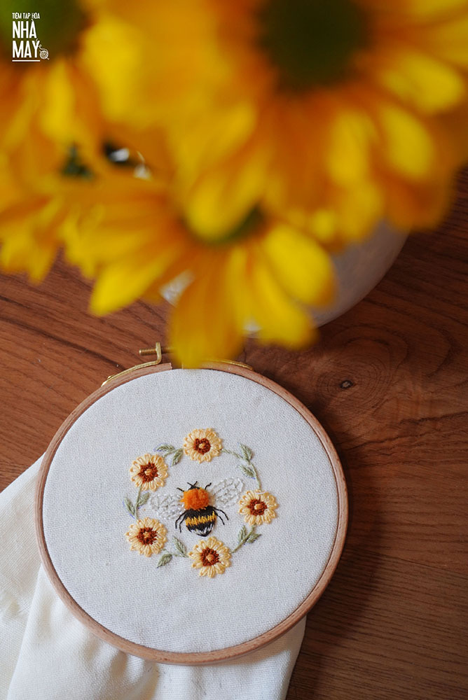 Thêu ong vàng để nhắc mình luôn kiên trì, chăm chỉ, còn hoa hướng dương chính là thông điệp của sự lạc quan, luôn hướng về phía mặt trời tươi sáng! Các chị em cùng Tiệm thêu thùa chút nha!