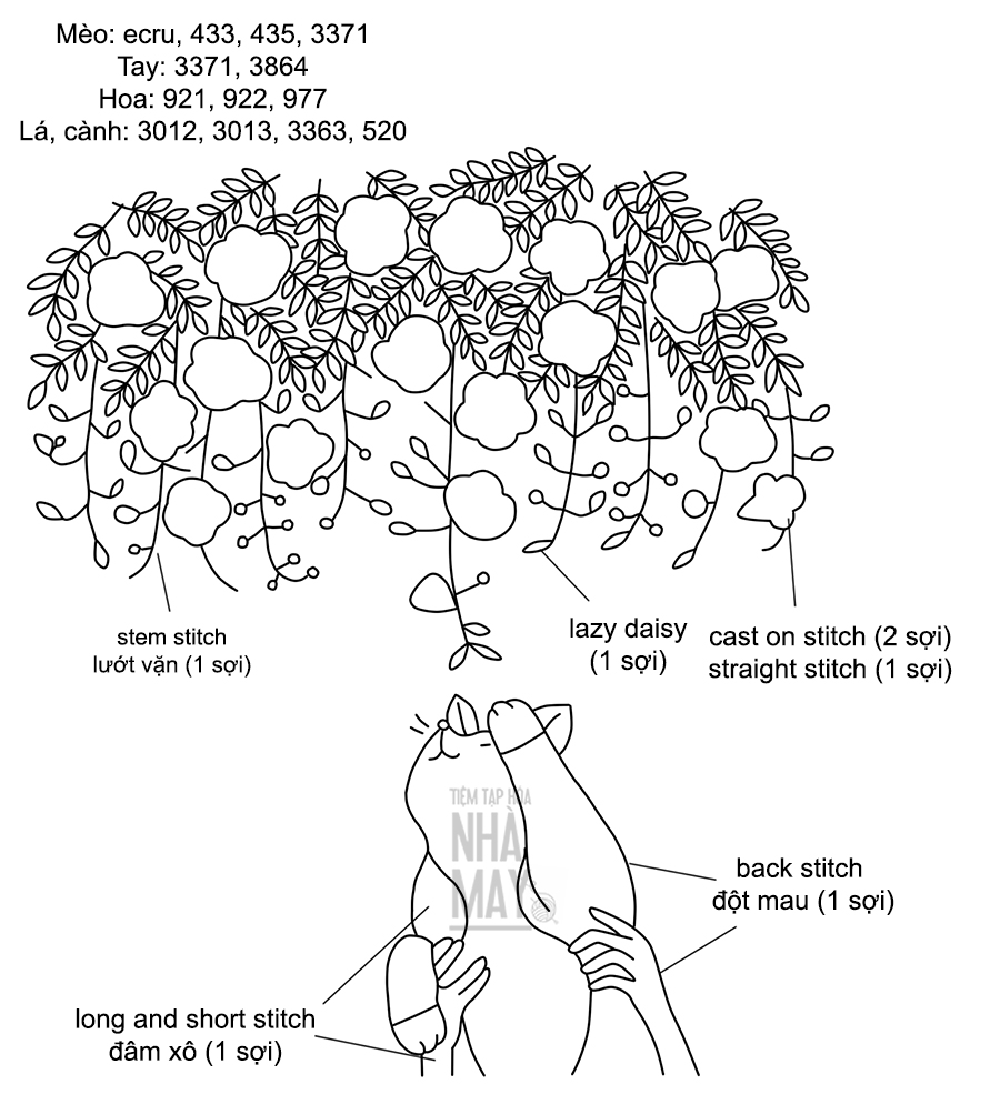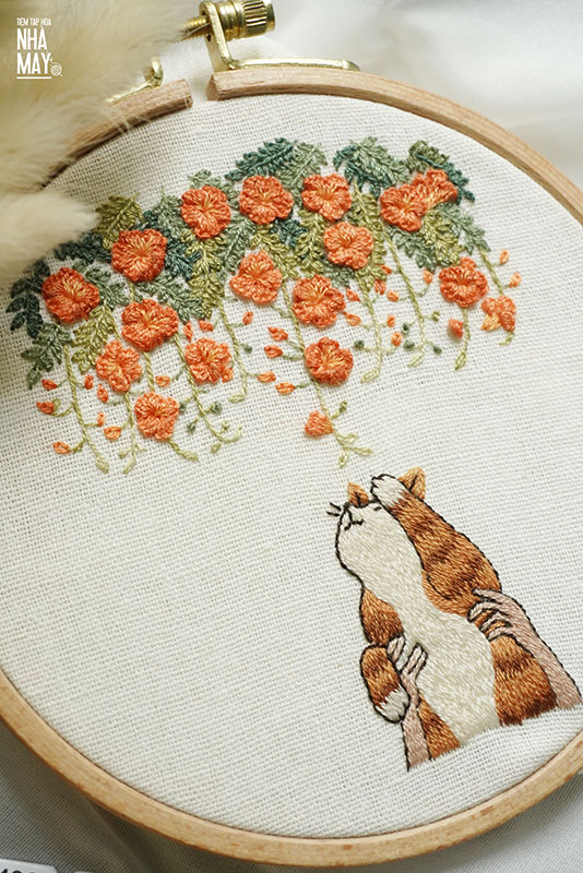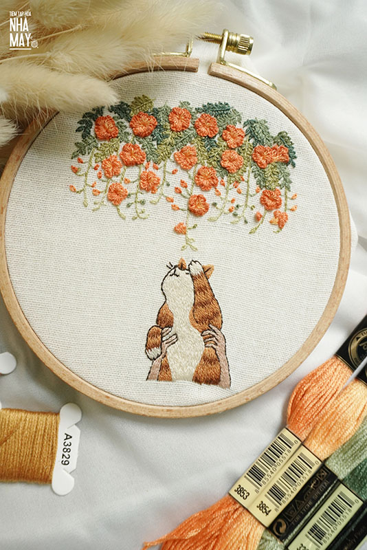 Thêu chú mèo bên giàn hoa nhỏ (có mẫu in)