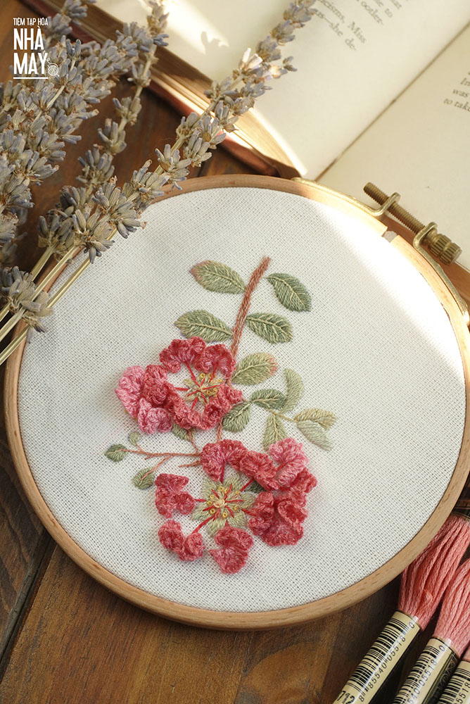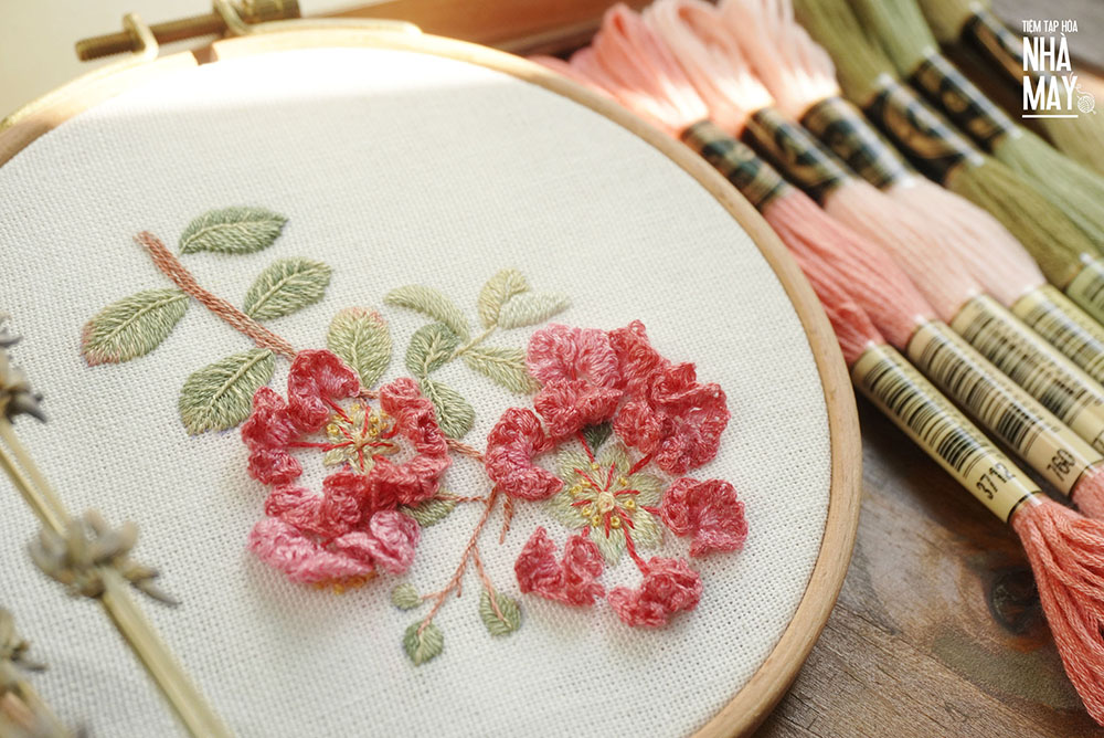 Thêu hoa Tường Vi một ngày cuối tháng 7. Mũi thêu này Tiệm sẽ có bài hướng dẫn kĩ hơn nha!