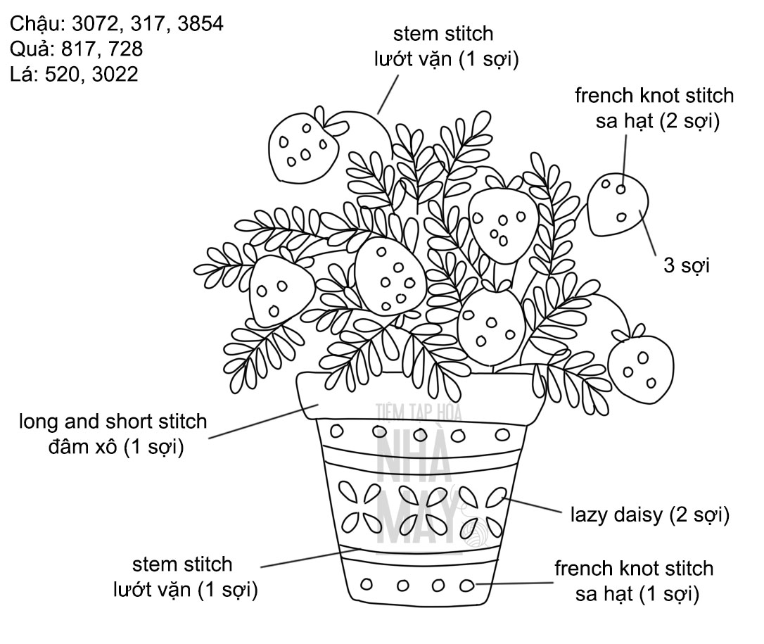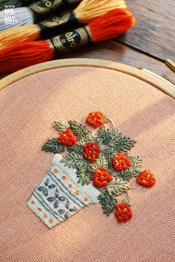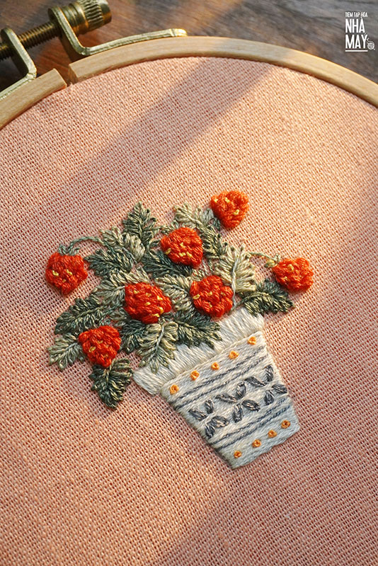 Thêu một chậu dâu tây trĩu quả (có mẫu in)