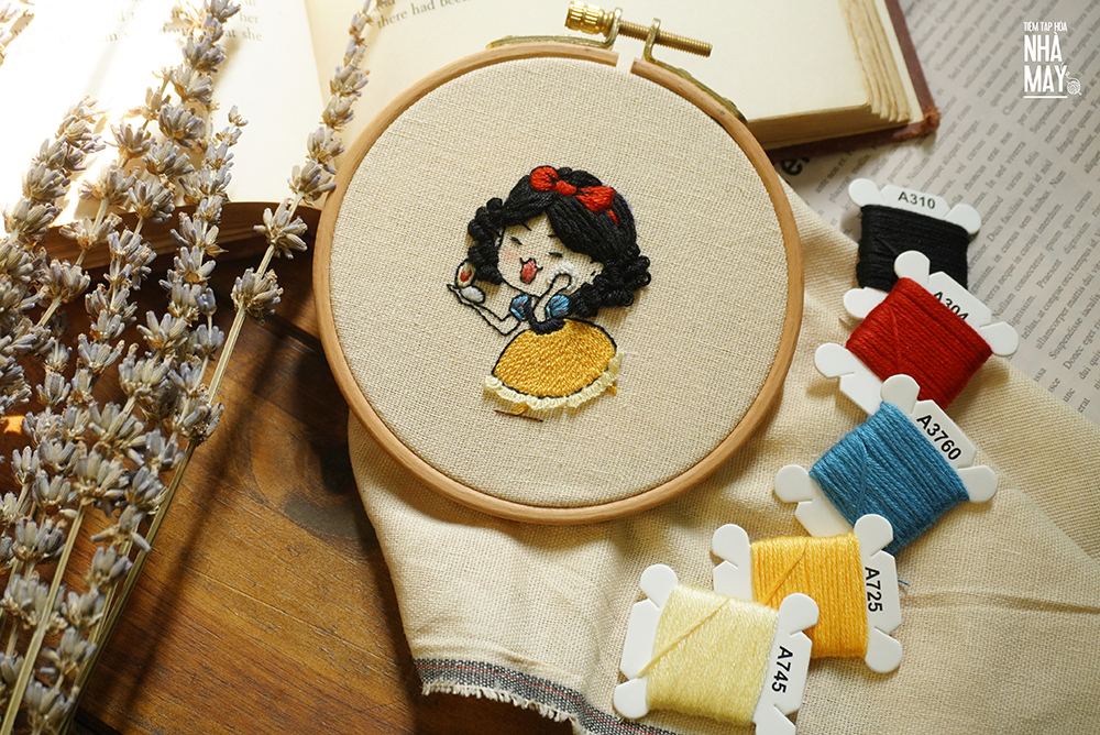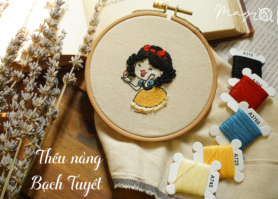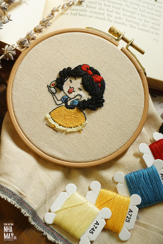 Thêu nàng Bạch Tuyết bằng các mũi thêu siêu quen thuộc nhưng được biến thể chút xíu thôi.