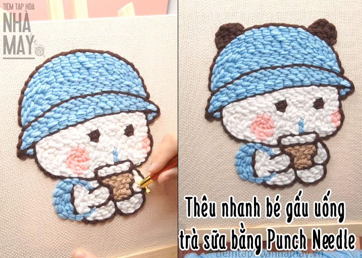 Thêu nhanh bé gấu uống trà sữa bằng len (Punch Needle)