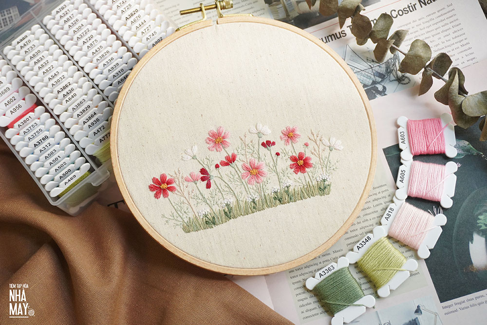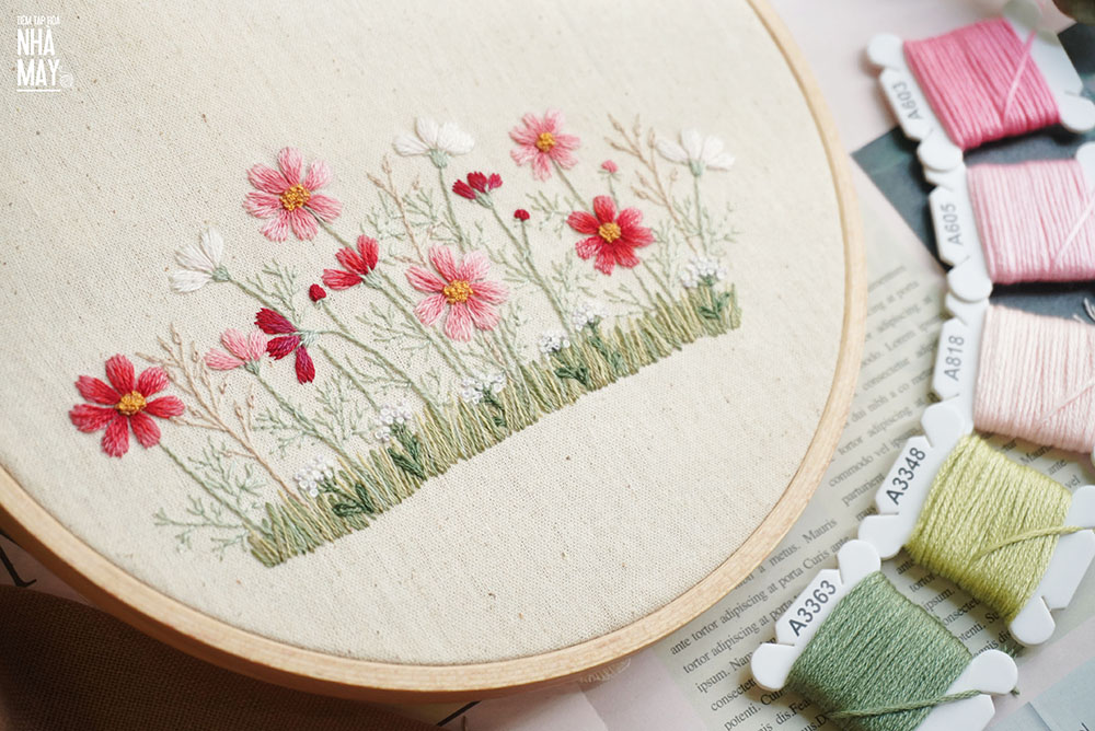 Thêu nhanh cánh đồng hoa đơn giản tông hồng đỏ (có mẫu in)