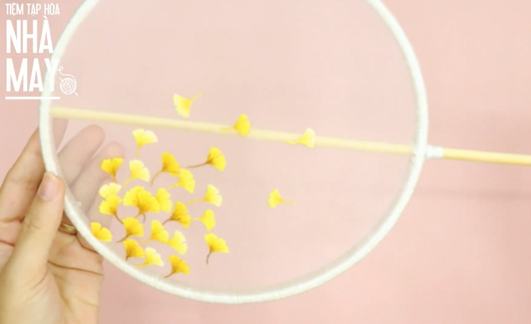 Đi kèm với vải voan bay bổng là hình thêu lá rẻ quạt vàng ươm sắc thu, mọi người có thể tự lựa chọn những hình thêu và màu sắc mình yêu thích để trang trí quạt nha.