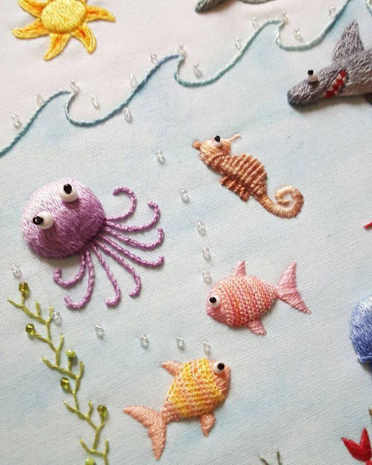 Để thêu một bức tranh về biển cần có sự phối màu cầu kỳ và kỹ lưỡng hơn, để các màu sắc hài hòa với nhau và vẫn mang đến cảm giác tươi mát nhẹ nhàng của biển nha.