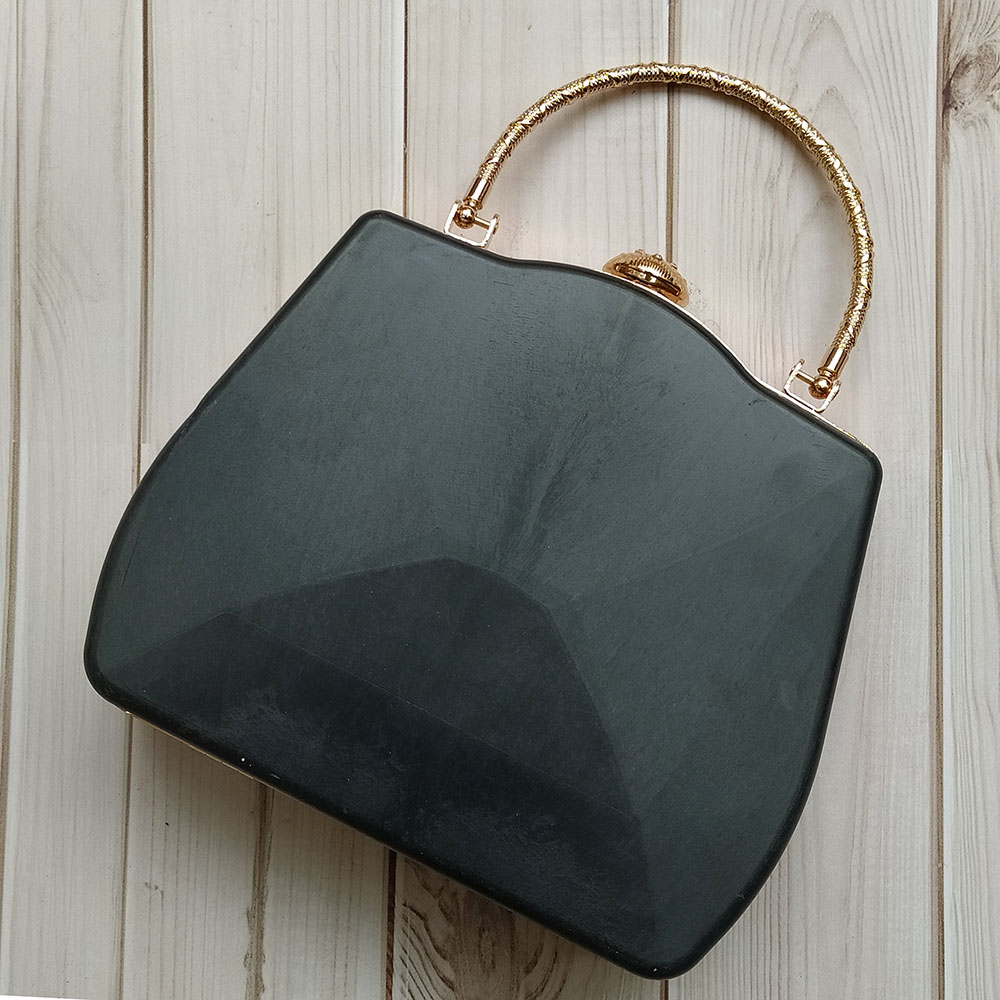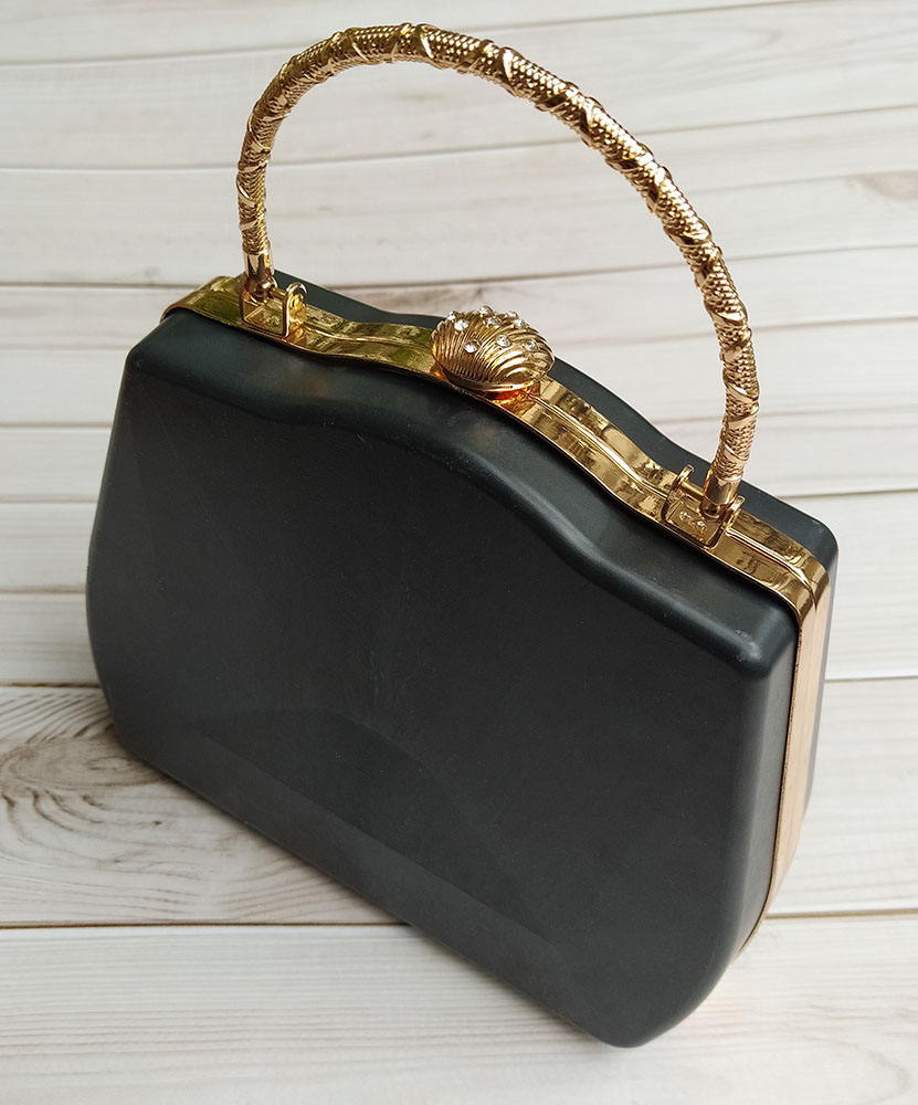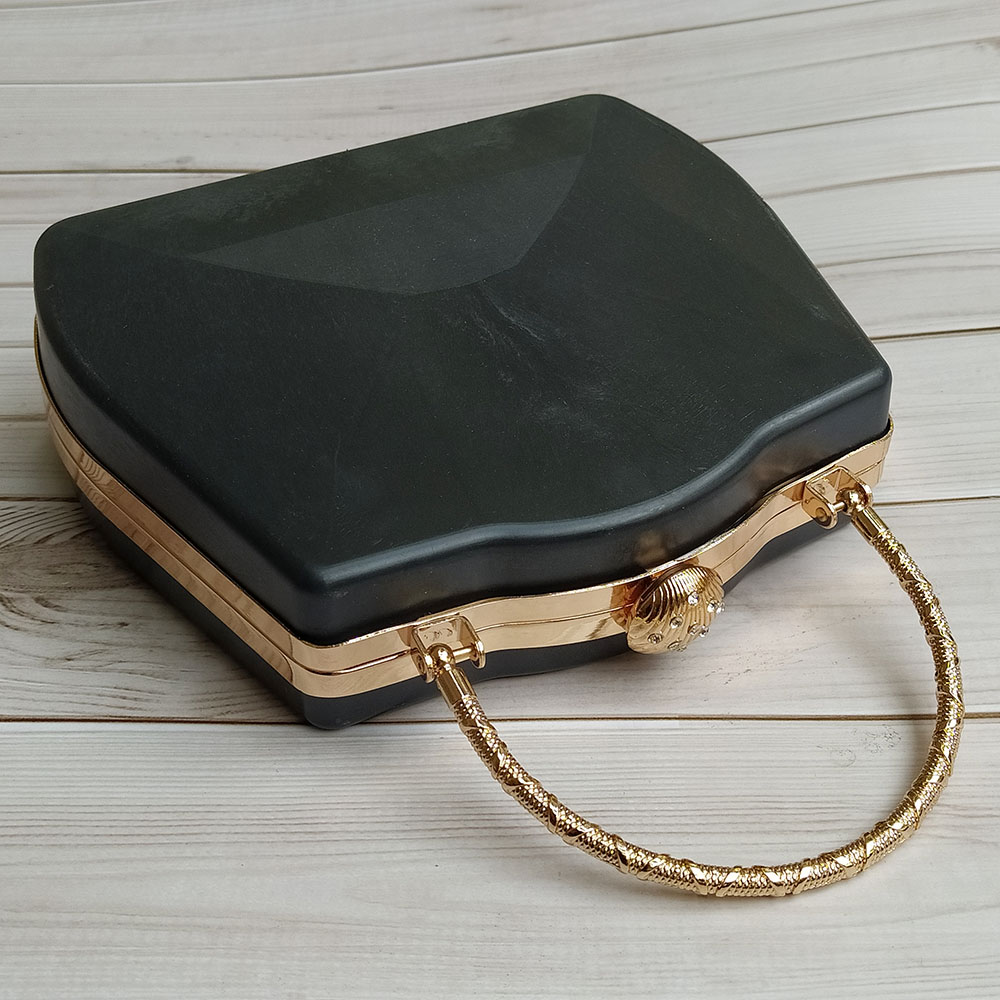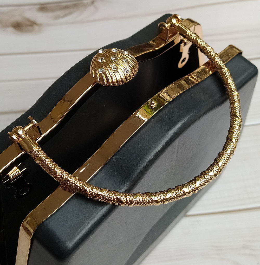 Phôi túi hình thang, bản lề bằng kim loại mạ vàng có chốt khóa hình vỏ sò. Khung bản lề vuông vắn, chắc chắn, có quai xách tiện lợi.