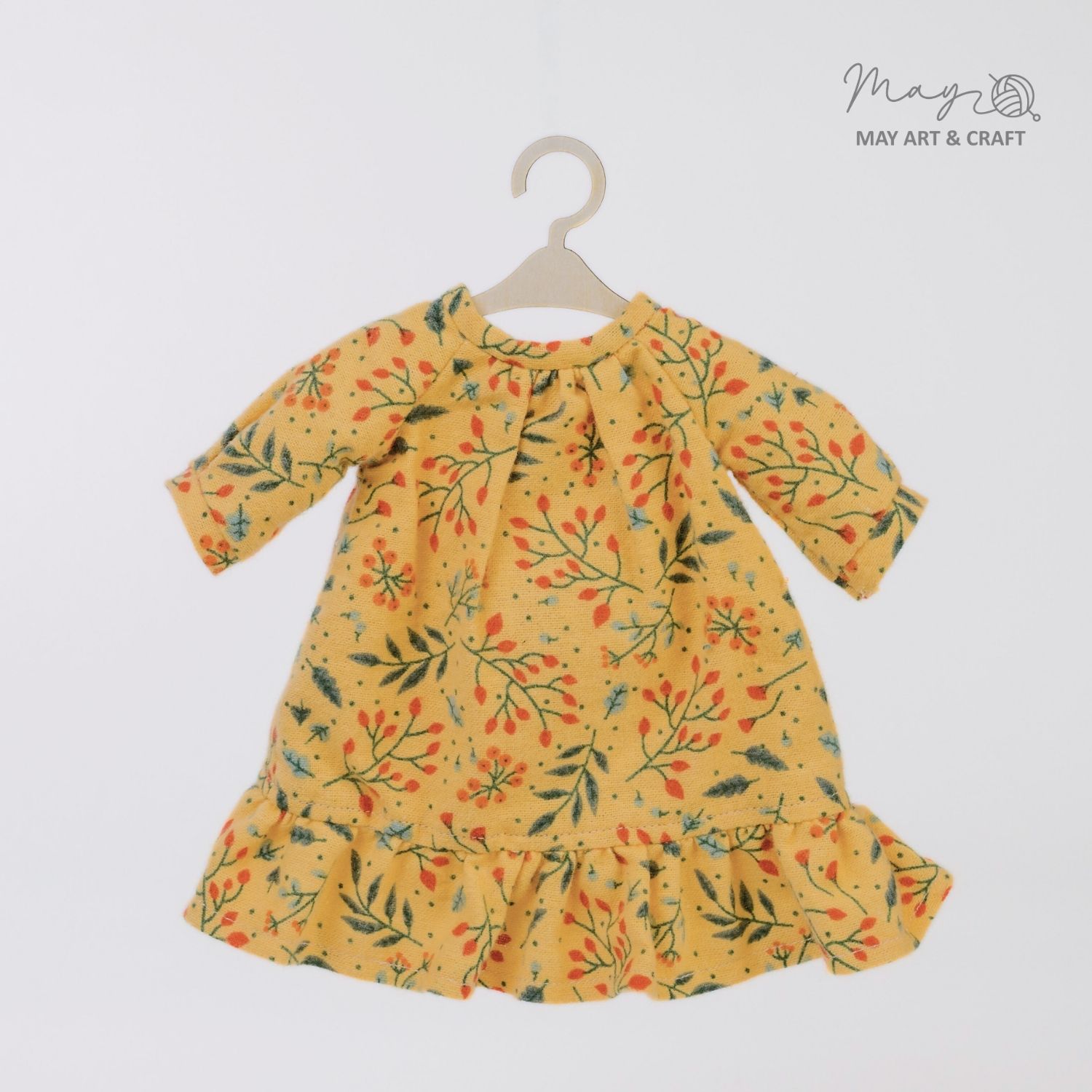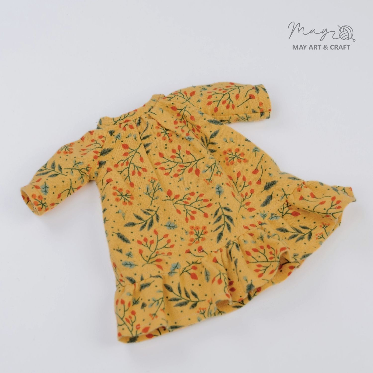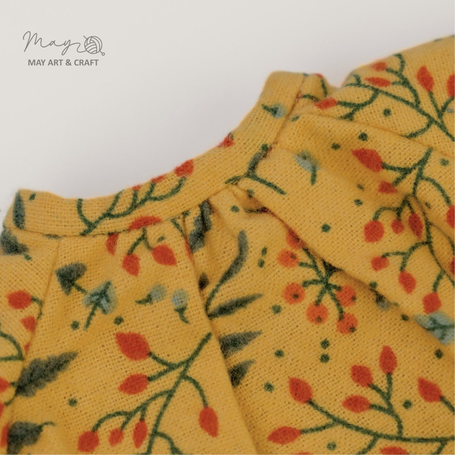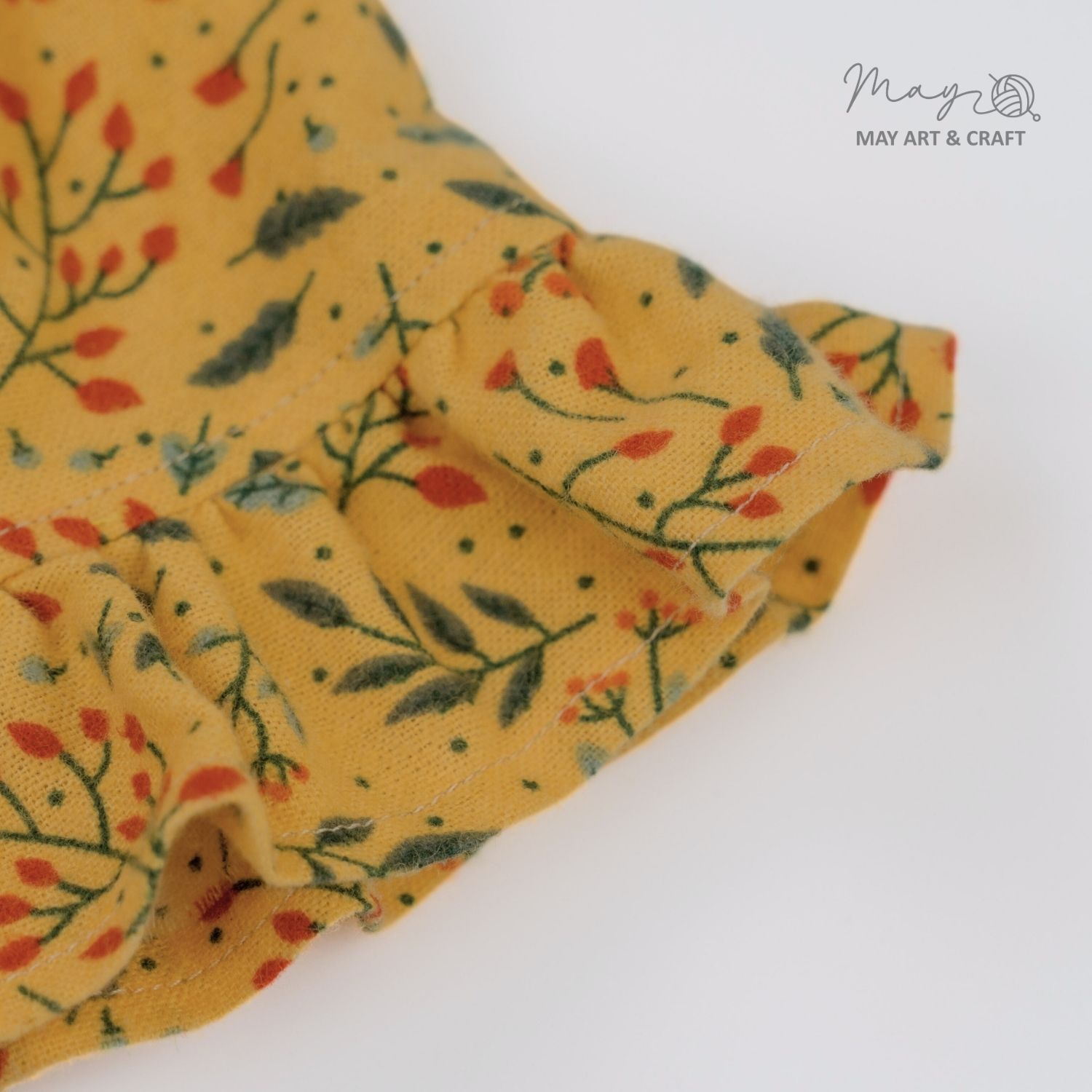 Váy cổ tròn chân bèo hoạ tiết hoa vàng nằm trong BST trang phục thú bông vải của Tiệm tạp hoá Nhà May.