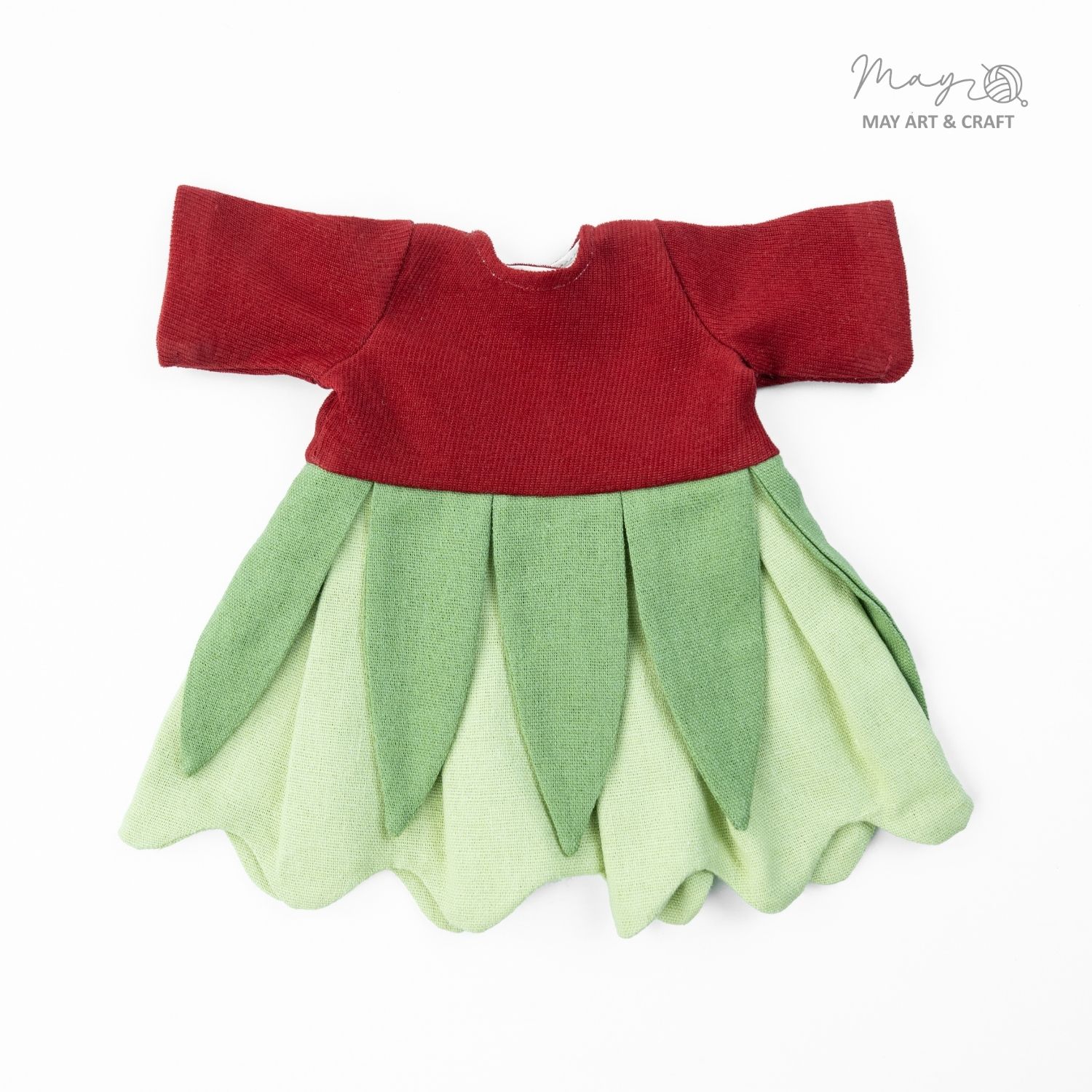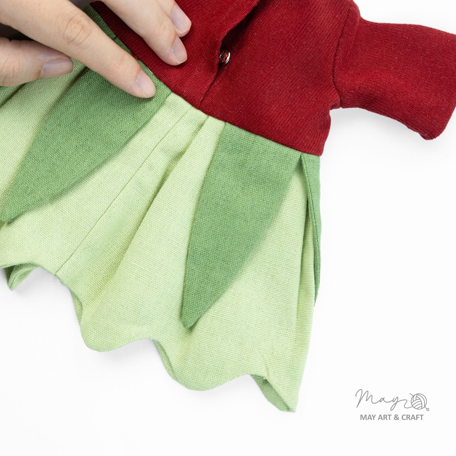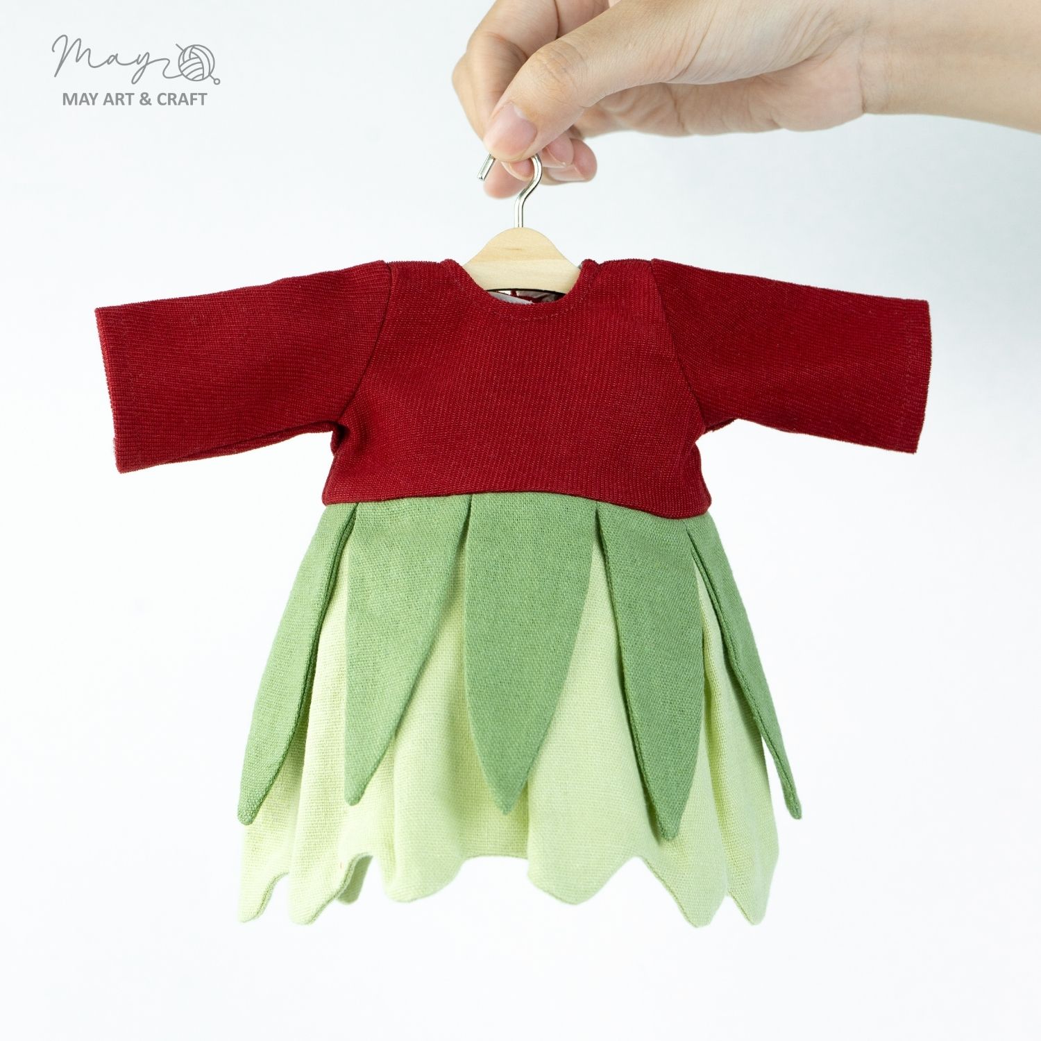 Váy xoè cây thông noel được lấy cảm hứng từ cây thông noel. Váy là sự kết hợp giữa phần thân áo màu đỏ, chất liệu nhung tăm và phần chân váy là vải linen. Chân váy có 2 lớp. Lớp ngoài được tạo kiểu và trang trí như một tầng lá cây thông.