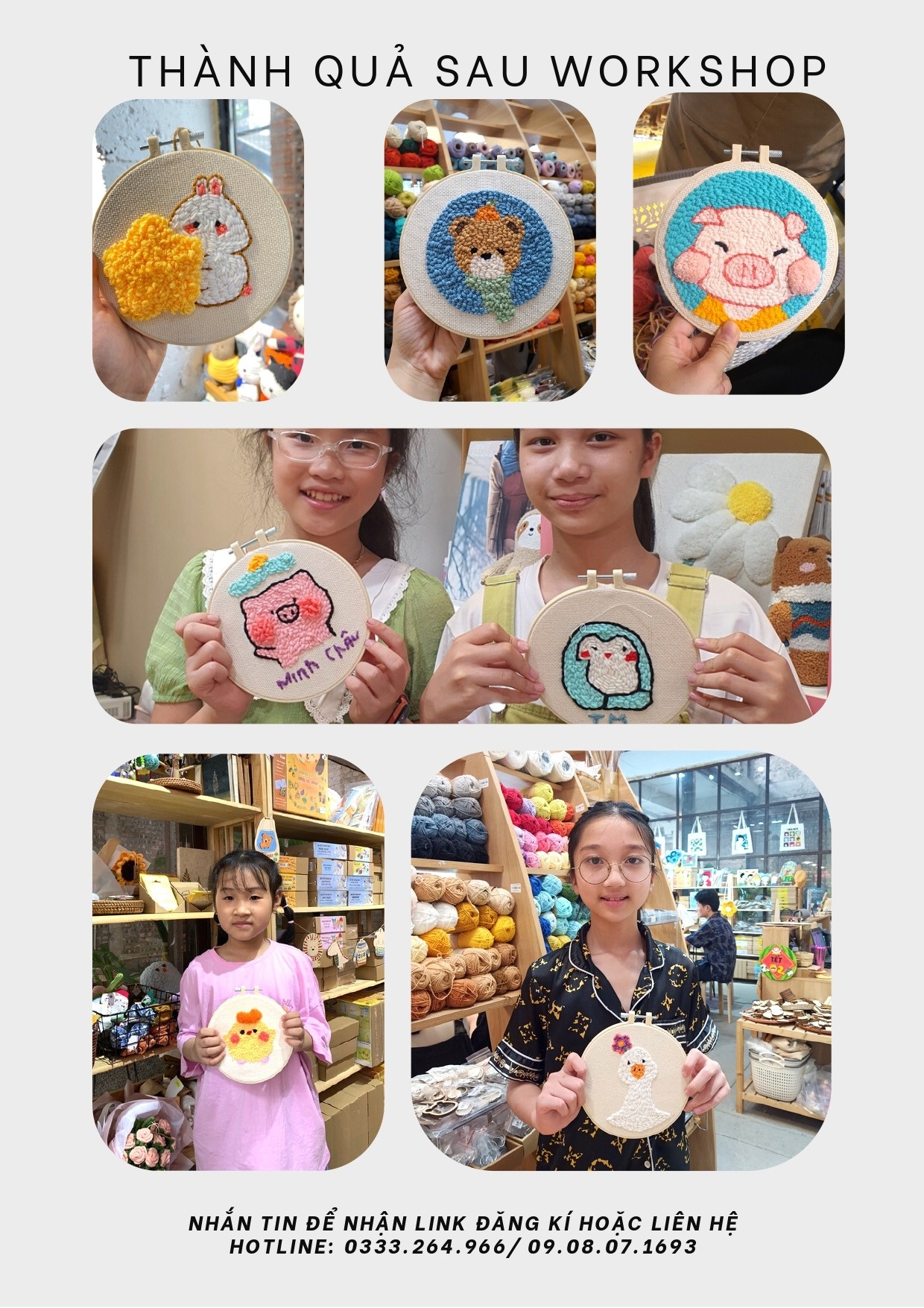 Trong 2 tiếng trải nghiệm, các bạn sẽ được hướng dẫn sử dụng các dụng cụ dùng trong thêu len nổi (punch needle), các kỹ thuật thêu len nổi cơ bản và ứng dụng vào thêu 1 bức tranh khung tròn theo sở thích. Trong quá trình làm sẽ luôn có hướng dẫn viên hỗ trợ các bạn nhỏ, chính vì vậy sau workshop bạn nào cũng có thể hoàn thiện một bức tranh của riêng mình.